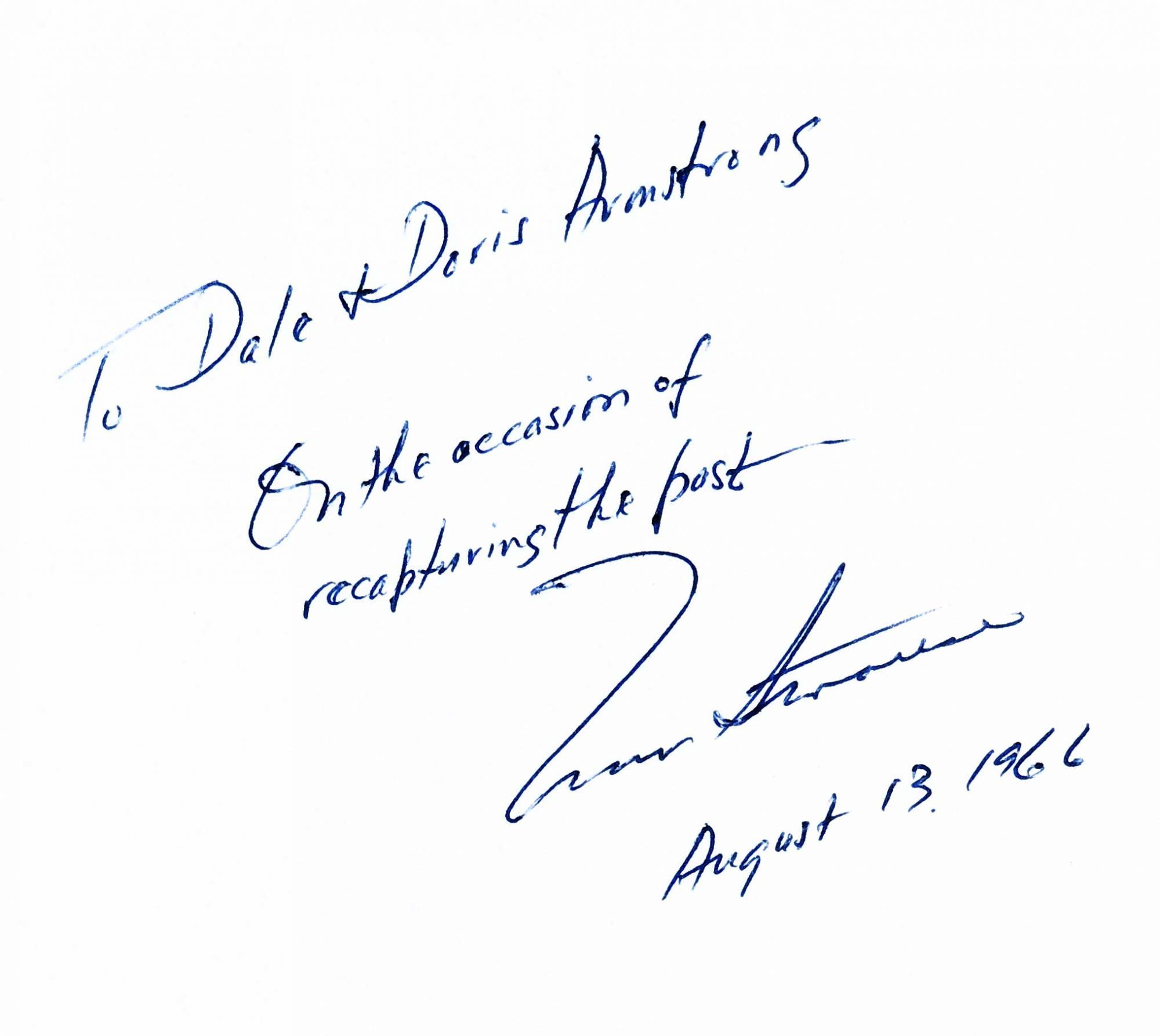 New York: Philip C. Duschnes, 1960. Hardcover. Near fine in very good jacket. Hardcover. First Edition. Presentation Copy, inscribed by the author to Dale and Doris Armstrong. 1 of 1250 copies. Near fine in grey paper patterned boards with red spine panel titled in black. Light wear to spine ends and edges, else fine. Clean, bright interior. In very good beige dust jacket with black title to spine and front panels. Minor wear to edges of jacket including a few short closed tears and slight browning. 42 pages. BOB/062510.