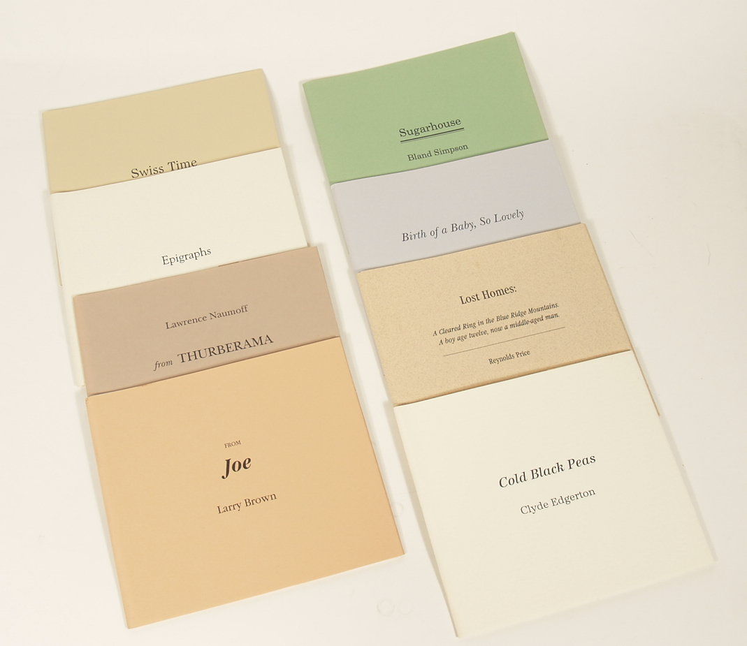 Chapel Hill, NC: The Mud Puppy Press, (1988). First Edition. Wraps. Fine. Complete set of eight limited edition chapbooks in printed color wraps, with original printed paper wraparound band. Of a total edition of 126, these are one of 26 lettered copies. Each chapbook is lettered "E" and SIGNED by its author. While individual numbered copies of these are readily available, an entire lettered set is quite scarce.