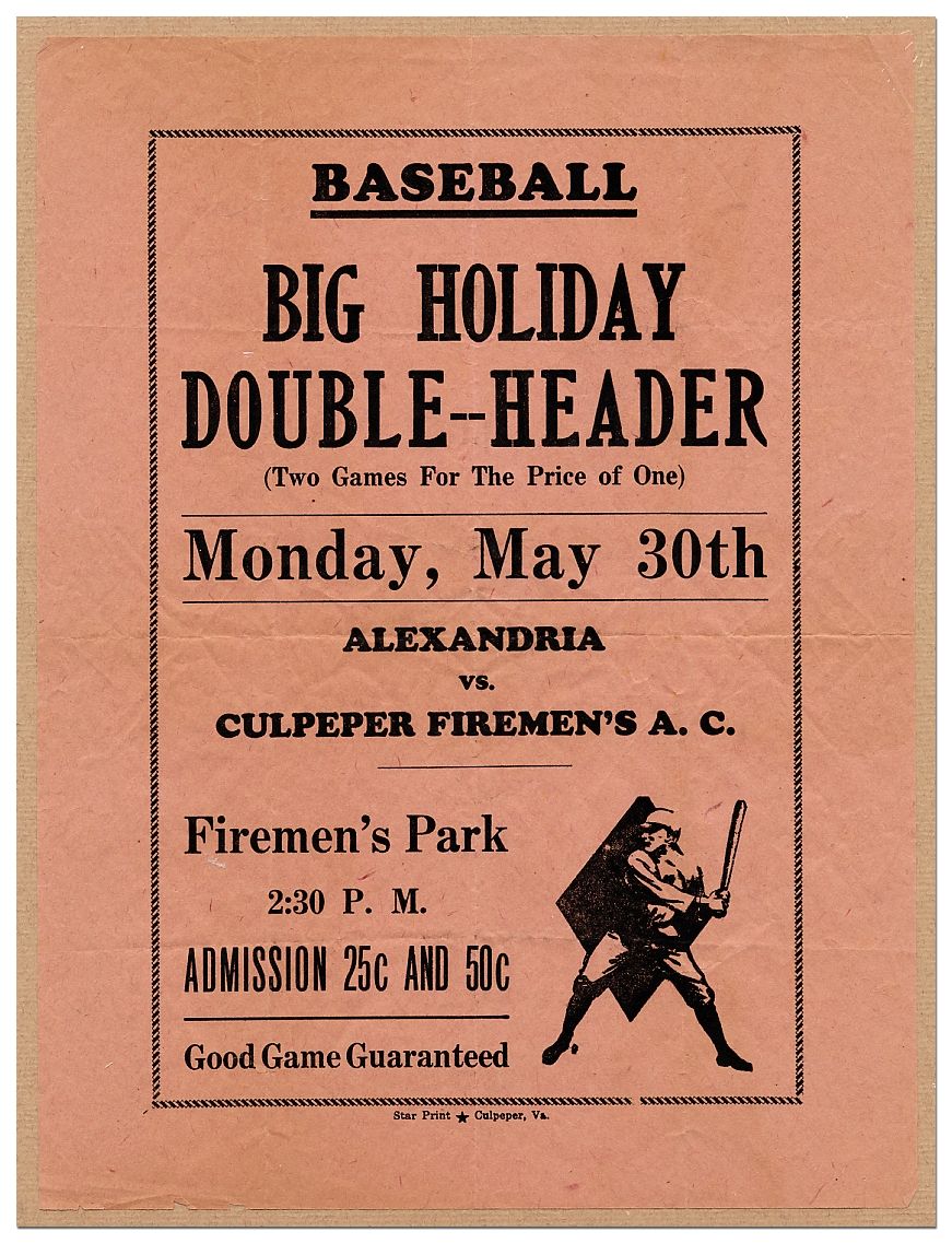[Broadside]: Baseball Big Holiday Double-Header (Two Games for the Price of One) Monday, May 30th Alexandria vs. Culpeper Firemen's A.C. Firemen's Park..