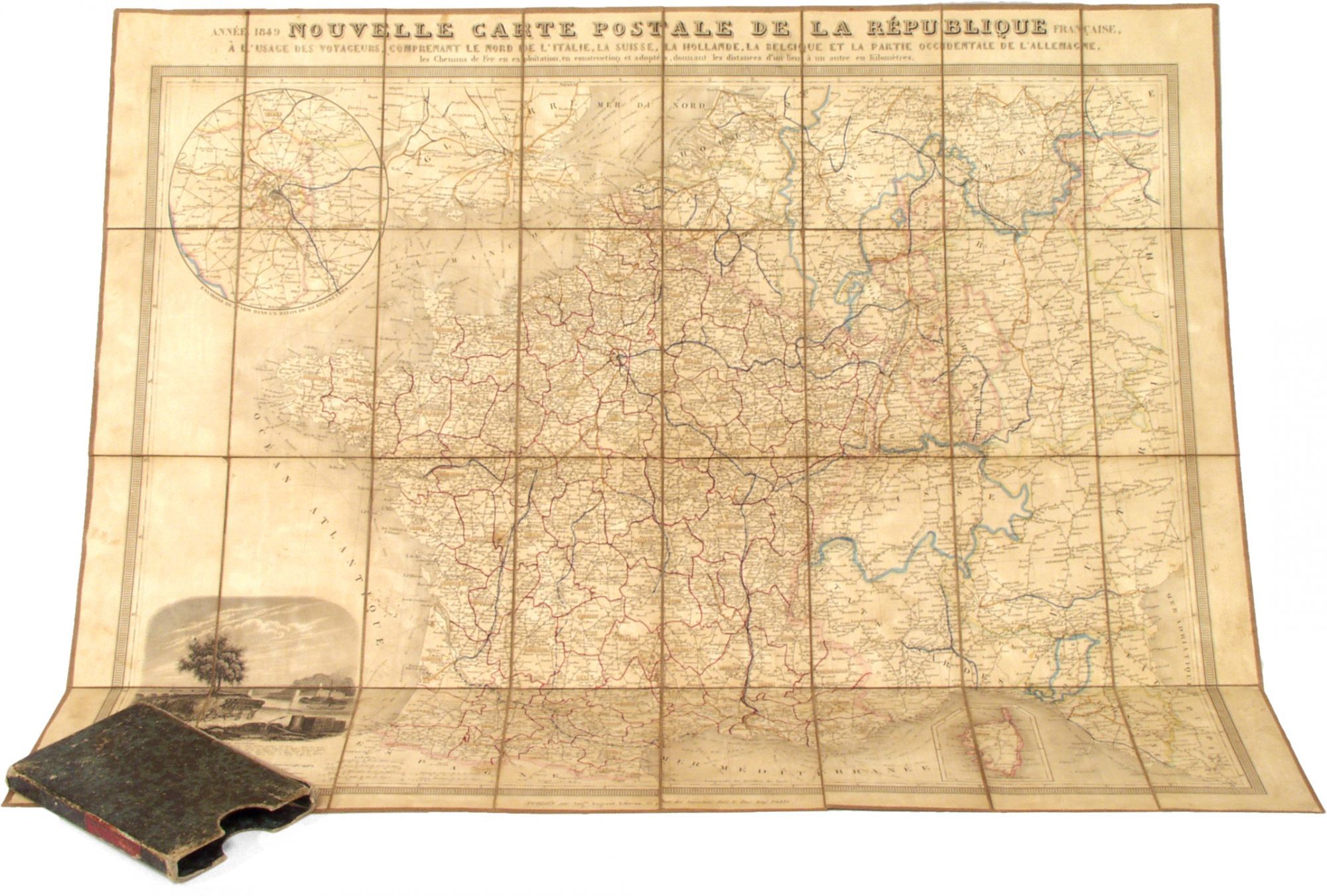 Paris: Auguste Logerot, 1849. Hardcover. Near Fine. Folding map of France. Paper over cloth-backed boards, unfolded 29.5" x 22.5", folds into 32 panels, housed in an oblong papercovered slipcase. Light soiling and age-toning to map panels, a chip to the verso label, about near fine, slipcase rubbed along the extremities and split along one edge, very good. An attractive and scarce survivor.