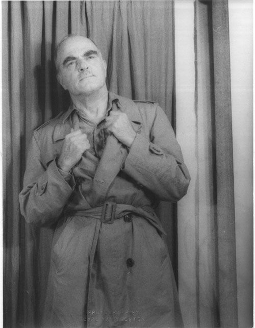 [New York], 1948. Gelatin silver print. 1 vols. 9-1/2 x 7/14 inches. Embossed stamp at lower edge, atelier stamp on verso, with pencilled notations giving the subject of the photograph ("Thornton Wilder 'The Skin of Your Teeth'"), the date, and the number of the negative. Gelatin silver print. 1 vols. 9-1/2 x 7/14 inches. Three-quarter length portrait of the playwright, standing, hands gripping the lapels of his overcoat.