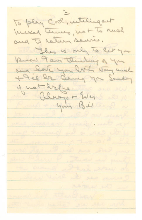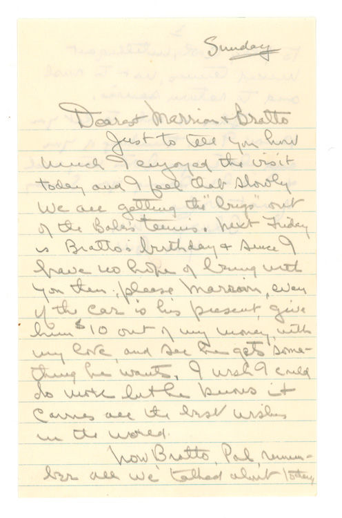 Tilden writes: “Dear Marrion and Bratto, Just to tell you how much I enjoyed the visit today … Next Friday is Bratto's birthday & since I have no hope of being with you then, please Marrion, even if the car is his present, give him $10 out of my money, with my love, and see he gets something he wants …” Tilden then turns to Arthur with tennis advice: “Now Bratto, Pal, remember all we talked about today, to play cool, intelligent mixed tennis, not to rush and to return service. This is only to let you know I am thinking of you and love you both very much & I’ll be seeing you Sunday if not before. Always & ever, Your Bill.”