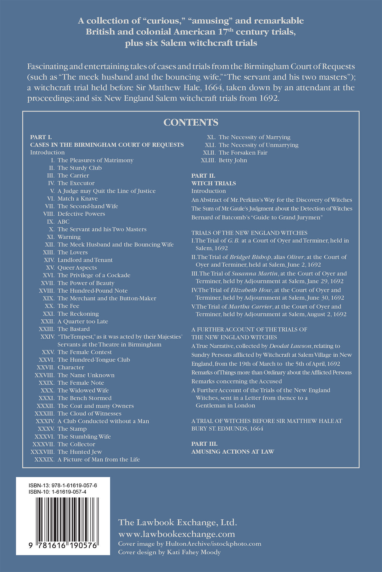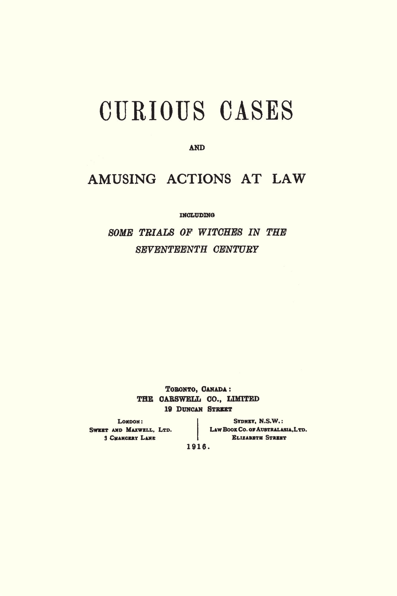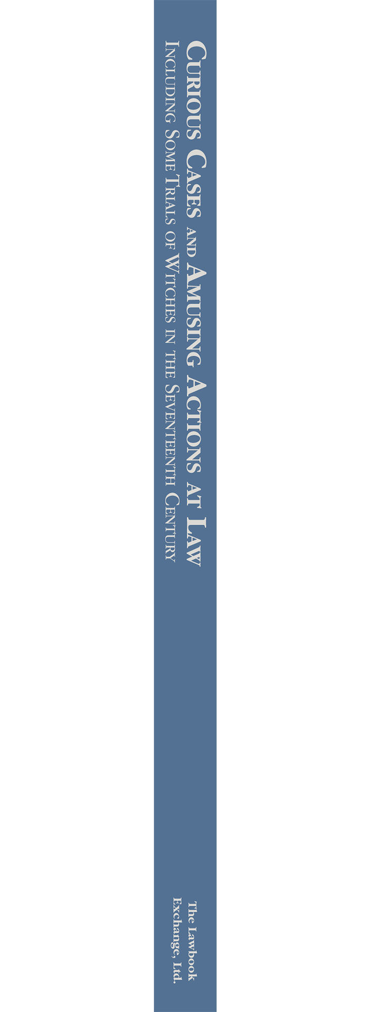 2010. ISBN-13: 9781616190576; ISBN-10: 1616190574. [Trials]. [Witchcraft]. Curious Cases and Amusing Actions at Law Including Some Trials of Witches in the Seventeenth Century. Originally published: Toronto: The Carswell Co., Limited, 1916. vii, 234 pp. Reprinted 2010 by The Lawbook Exchange, Ltd. ISBN-13: 9781616190576; ISBN-10: 1616190574. Paperback. New. $16.95 * Fascinating and entertaining tales of cases and trials from the Birmingham Court of Requests, such as "The meek husband and the bouncing wife" and "The servant and his two masters," a witchcraft trial held before Sir Matthew Hale, 1664, taken down by an attendant at the proceedings, and six New England Salem witchcraft trials from 1692.