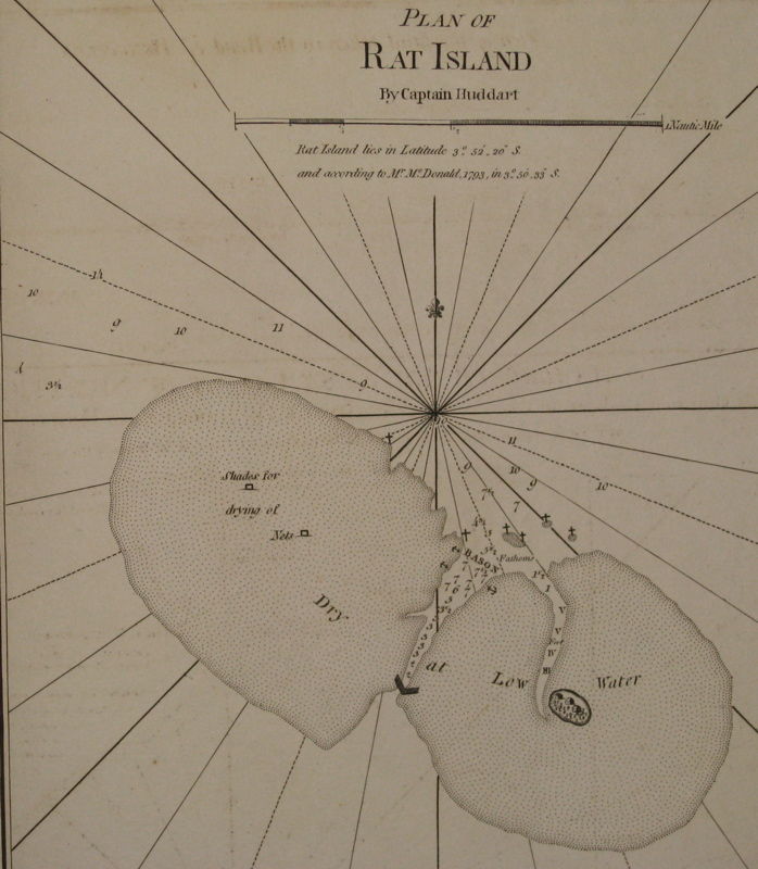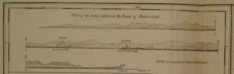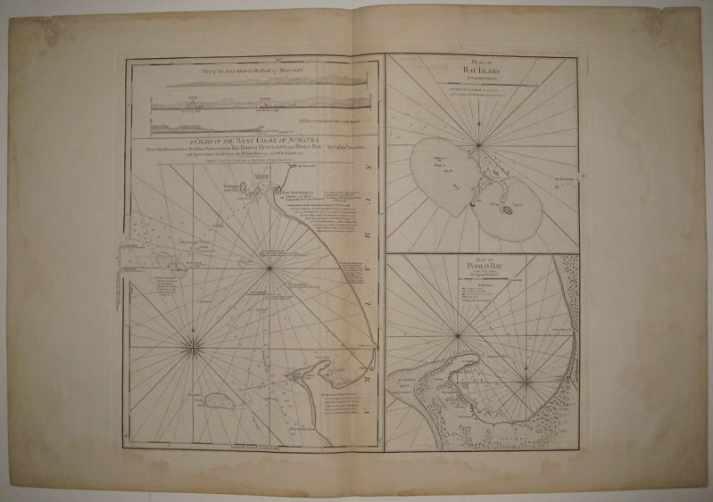 Beautiful chart of the southwestern coast of Sumatra. Includes rhumb lines, depths, shoals and inland swamps, the paths of previous explorations, a compass rose and two inset maps: "Plan of Rat Island", "Plan of Poolo Bay". The coast lines are further illustrated with with several topographical cross sections and scattered sailing notes and observations. Also shown is Fort Marlborough in what is today Bengkulu, which guarded an important port for the British East India Company. Published in "The East-India Pilot, or Oriental Navigator, on One Hundred and Eighteen Plates: Containing a Complete Collection of Charts and Plans, &c..." (plate 93). Maps are based on the 1745 French "Neptune Oriental" by Jean Baptiste Nicolas Denis d'Apres de Mannevillette. The later English editions include additions by Captain Joseph Huddart, John Price and Mr. McDonald. Minor dampstaining and offsetting with some stains to upper corners. Full original margins.