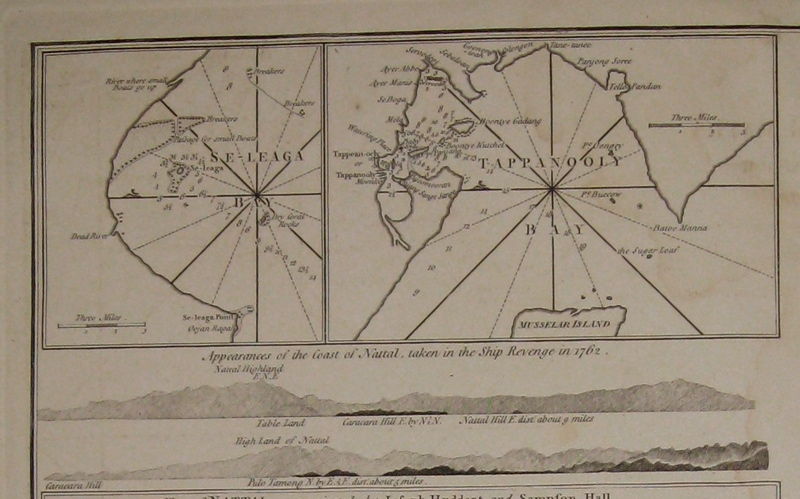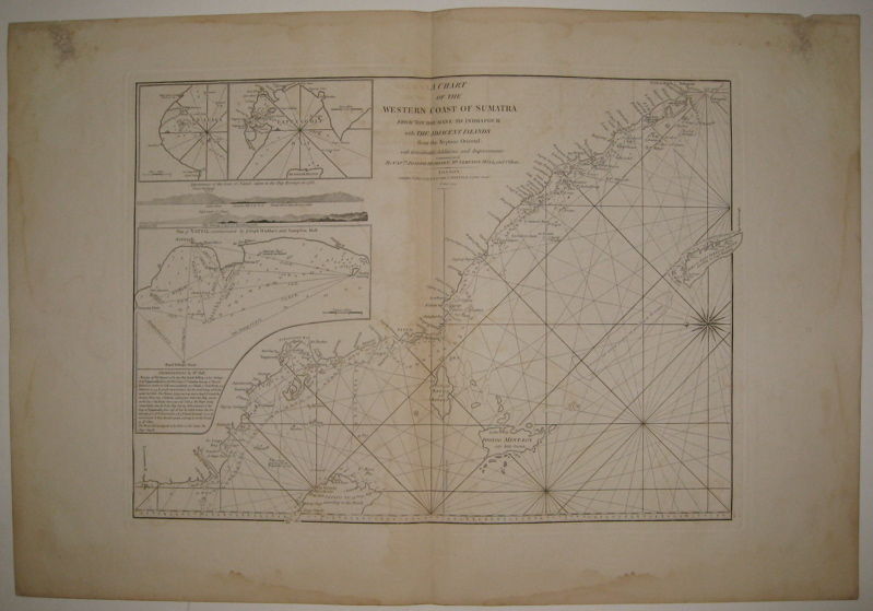 Beautiful chart of the central western coast of Sumatra. Includes rhumb lines, depths and shoals, the paths of previous explorations, a compass rose and three inset maps: "Se-Leaga Bay", "Tappanooly Bay" and "Plan of Nattal", the last of which includes sailing notes by Sampson Hall. The coast lines are further illustrated with with several topographical cross sections. Published in "The East-India Pilot, or Oriental Navigator, on One Hundred and Eighteen Plates: Containing a Complete Collection of Charts and Plans, &c..." (plate 90). Maps are based on the 1745 French "Neptune Oriental" by Jean Baptiste Nicolas Denis d'Apres de Mannevillette. The later English editions include additions by Captain Joseph Huddart and Sampson Hall. Minor dampstaining and offsetting with some stains to upper corners and along centerfold. Full original margins.