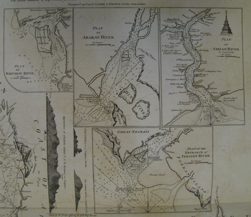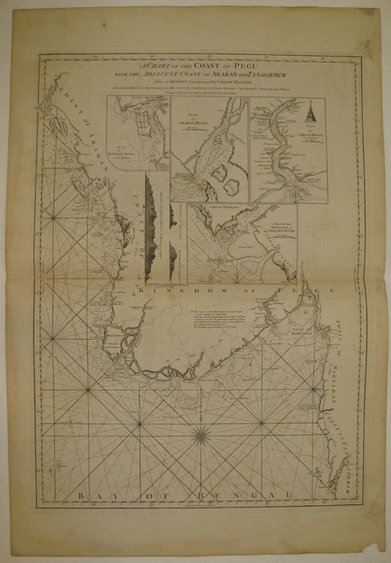 Magnificent and intricate sea chart showing the coast of the Burman Peninsula from the Bay of Bengal to the Gulf of Martaban. Details include rhumb lines, depths, and a compass rose. Dotted lines indicate rivers whose paths are not definitively known. Four insets show close ups of the Martaban River, the Arakan River, the Sirian River and the entrance of the Perseen River. Three topographical cross-sections show Foul Island, Tree Island and Cheduba Island. Additional views include three dimensional depictions of some coast lines and a pagoda. Published in "The East-India Pilot, or Oriental Navigator, on One Hundred and Eighteen Plates: Containing a Complete Collection of Charts and Plans, &c..." (plate 78). Maps are based on the 1745 French "Neptune Oriental" by Jean Baptiste Nicolas Denis d'Apres de Mannevillette. The later English editions include additions by Captain Hayter, Captain John Ritchie and Captain Charles Newland. With its beautiful and unusual visual approach, this incredibly scarce sea chart is rarely available for sale. Minor overall toning and offsetting and transference. Chip to bottom right corner of margin, image not affected. Full original margins.