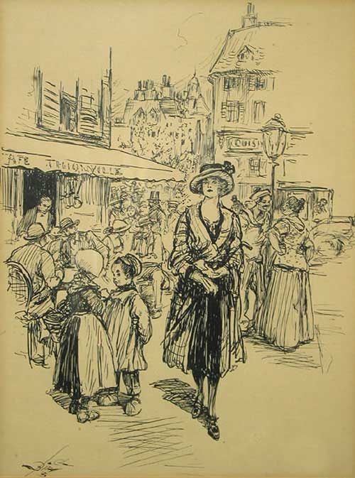 Pen and Ink Drawing depicting a Fashionable Lady standing in Front of a Parisian Café