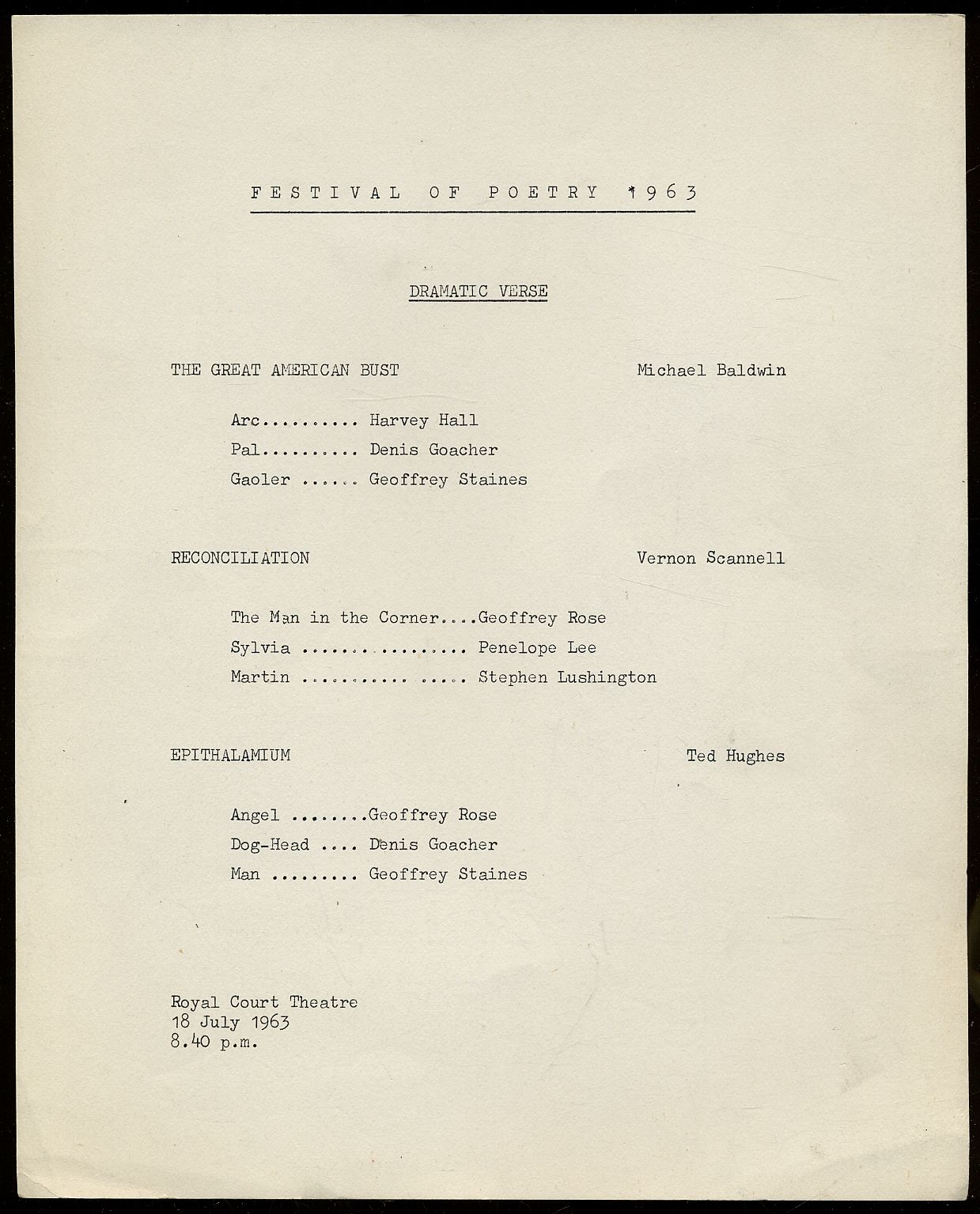 [Broadside]: Festival of Poetry 1963. Dramatic Verse. The Great American Bust. Michael Baldwin... Reconciliation. Vernon Scannell...Epithalium. Ted Hughes..