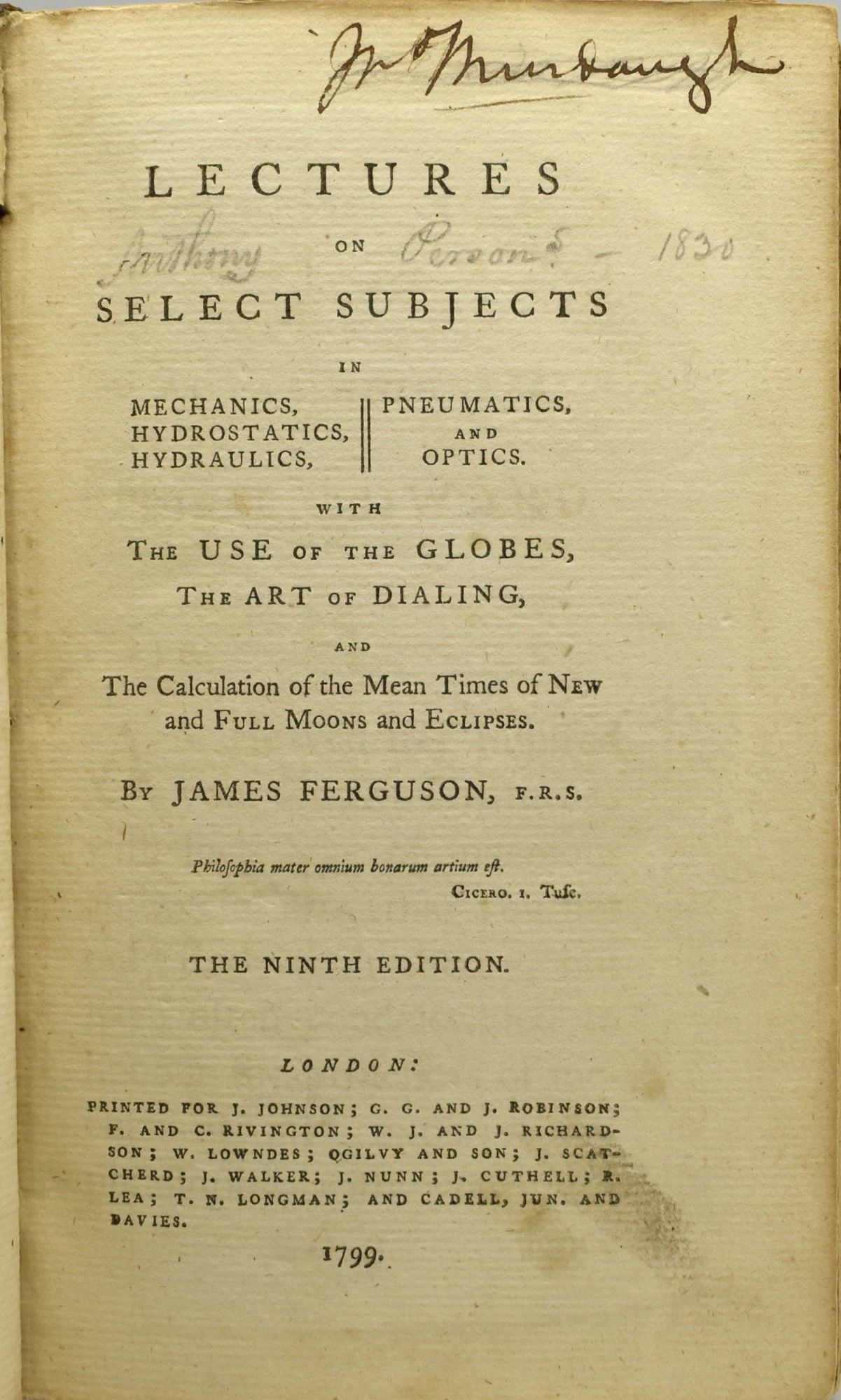 LECTURES ON SELECT SUBJECTS IN MECHANICS, HYDROSTATICS, HYDRAULICS, PNEUMATICS, AND OPTICS. WITH THE USE OF THE GLOBES, THE ART OF DIALING, AND THE CALCULATION OF THE MEAN TIMES OF NEW AND FULL MOONS AND ECLIPSES