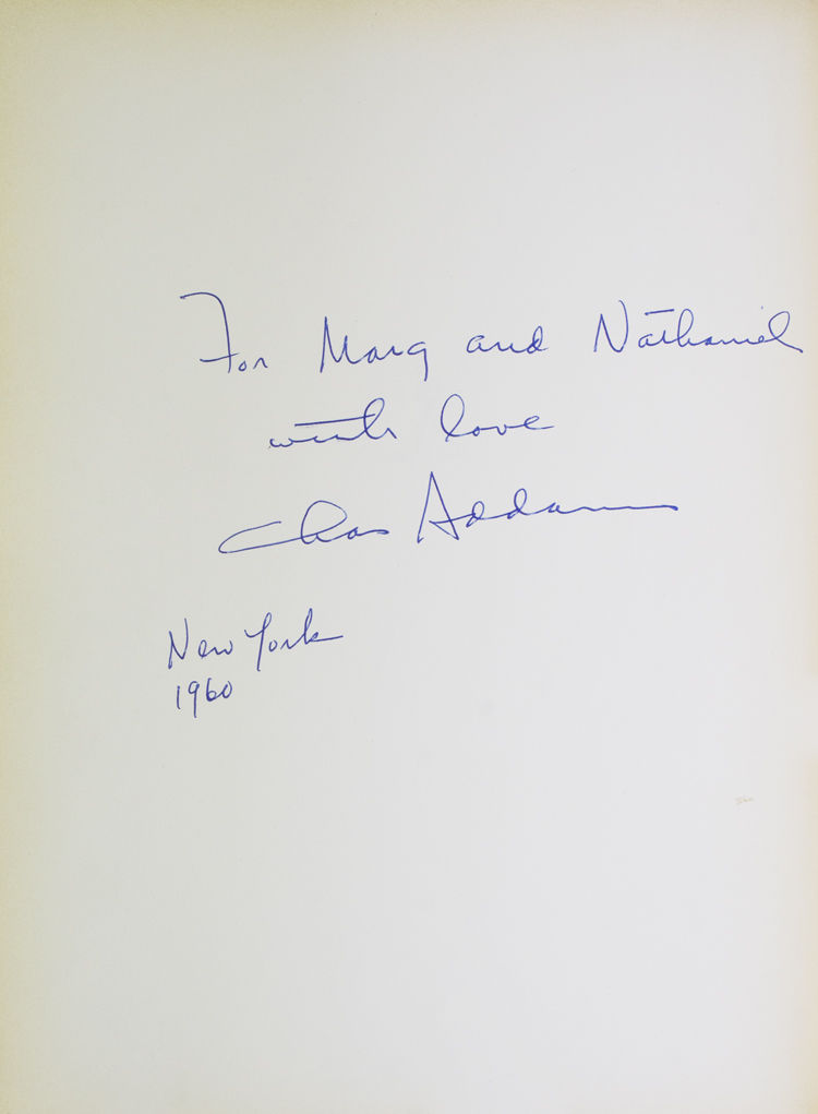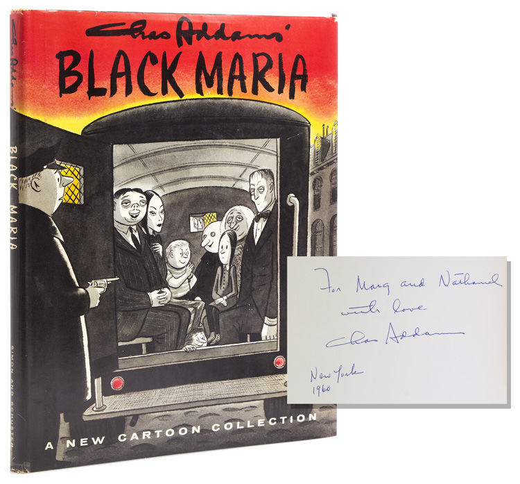 New York: Simon and Schuster, 1960. First edition. B/w cartoons throughout. 96 pp. 4to. Publisher’s boards, very good, in near fine dustjacket,. First edition. B/w cartoons throughout. 96 pp. 4to. Inscribed to author Nathaniel Benchley and his wife, “For Marg and Nathaniel with love, Chas Addams, New York, 1960.” Addams designed the jacket to Benchley’s children’s book The Visitors (1965).