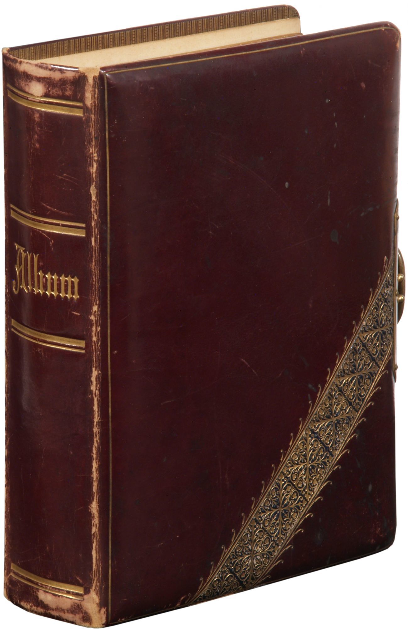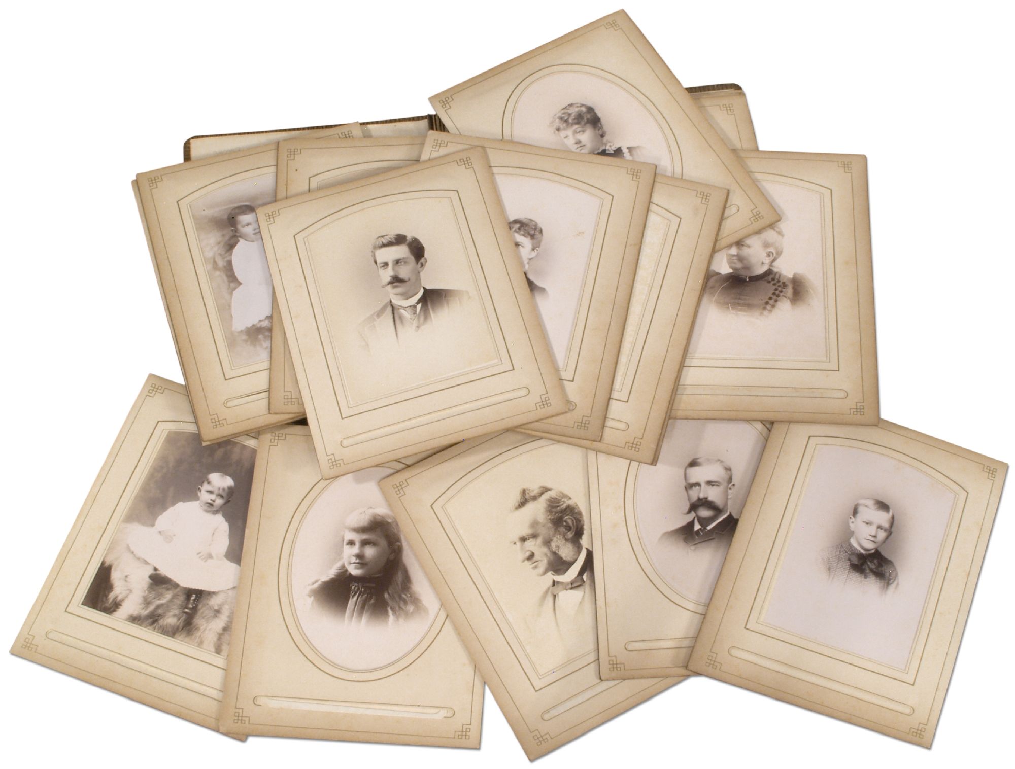 1890. Hardcover. Fine. Photo album containing 36 cabinet cards. Measuring 7" x 8.25". Leatherette boards with dentelle strip and metal clasp, slightly rubbed, housing 36 cabinet cards in loose unbound pages, slightly age-toned, very good or better. The cabinet cards themselves are all near fine or better. While the people in the images remain unknown (except for one that is penciled "Lizzie" on the reverse), most were taken in New York City and half at the Fredericks' Knickerbocker Family Portrait Gallery on the corner of Broadway and 9th. Among the well-dressed adults are two young ladies, three young girls, three young boys, and two adorable toddlers. A handsome set of cabinet cards from the late 19th Century. Further details available upon request.