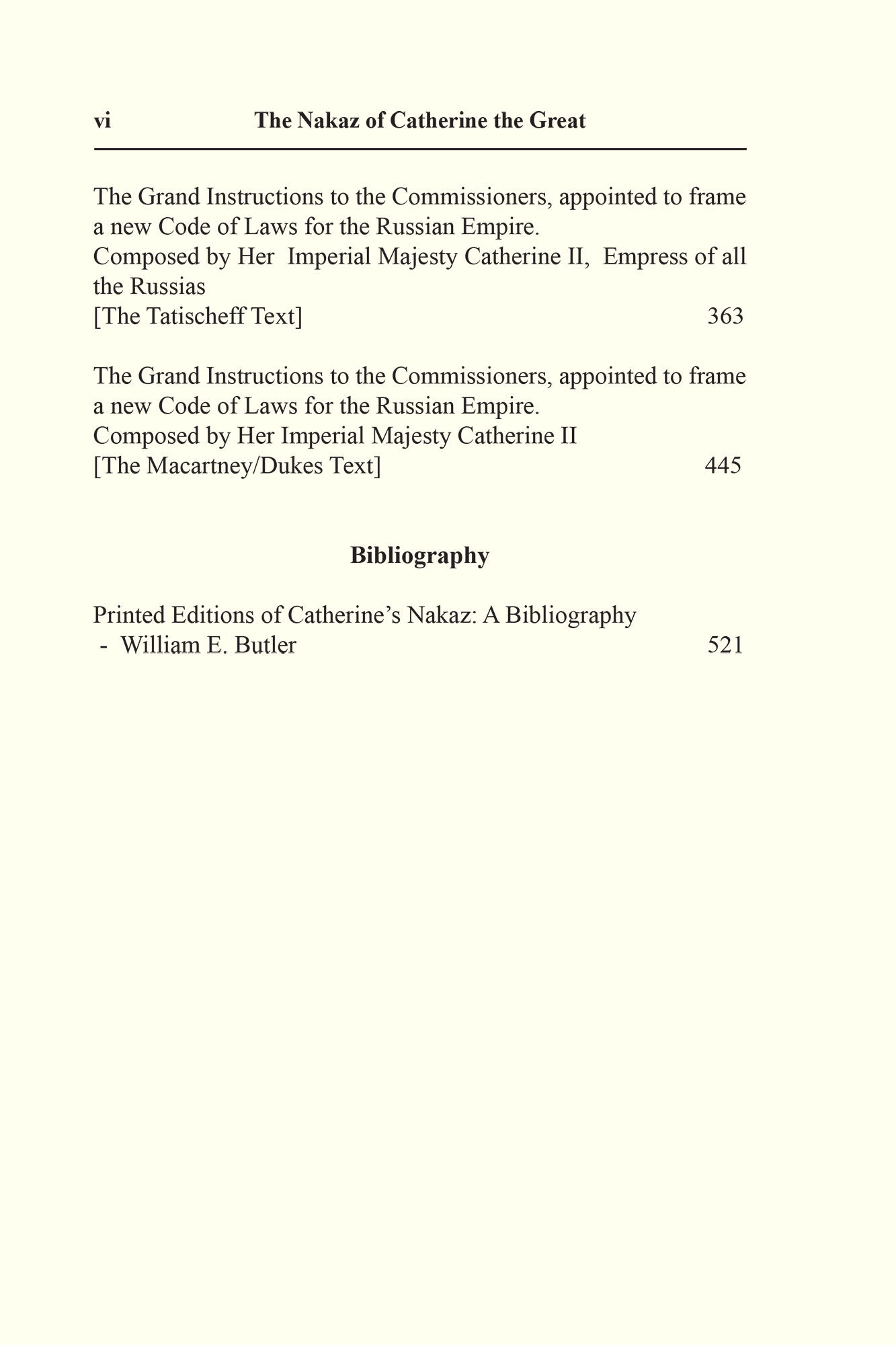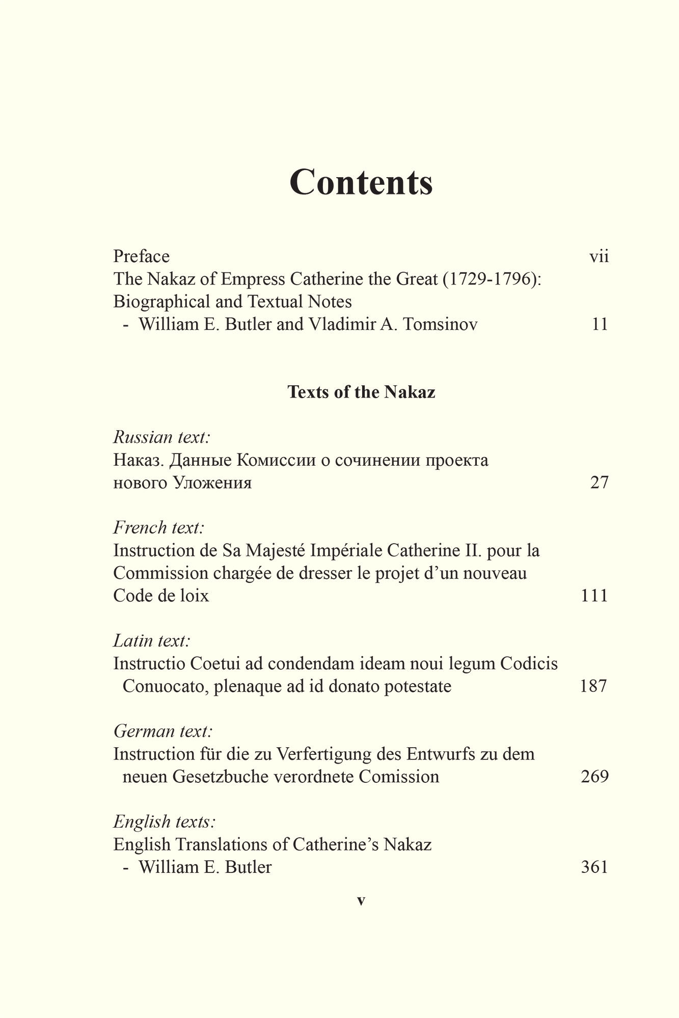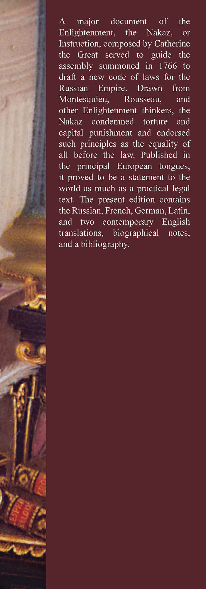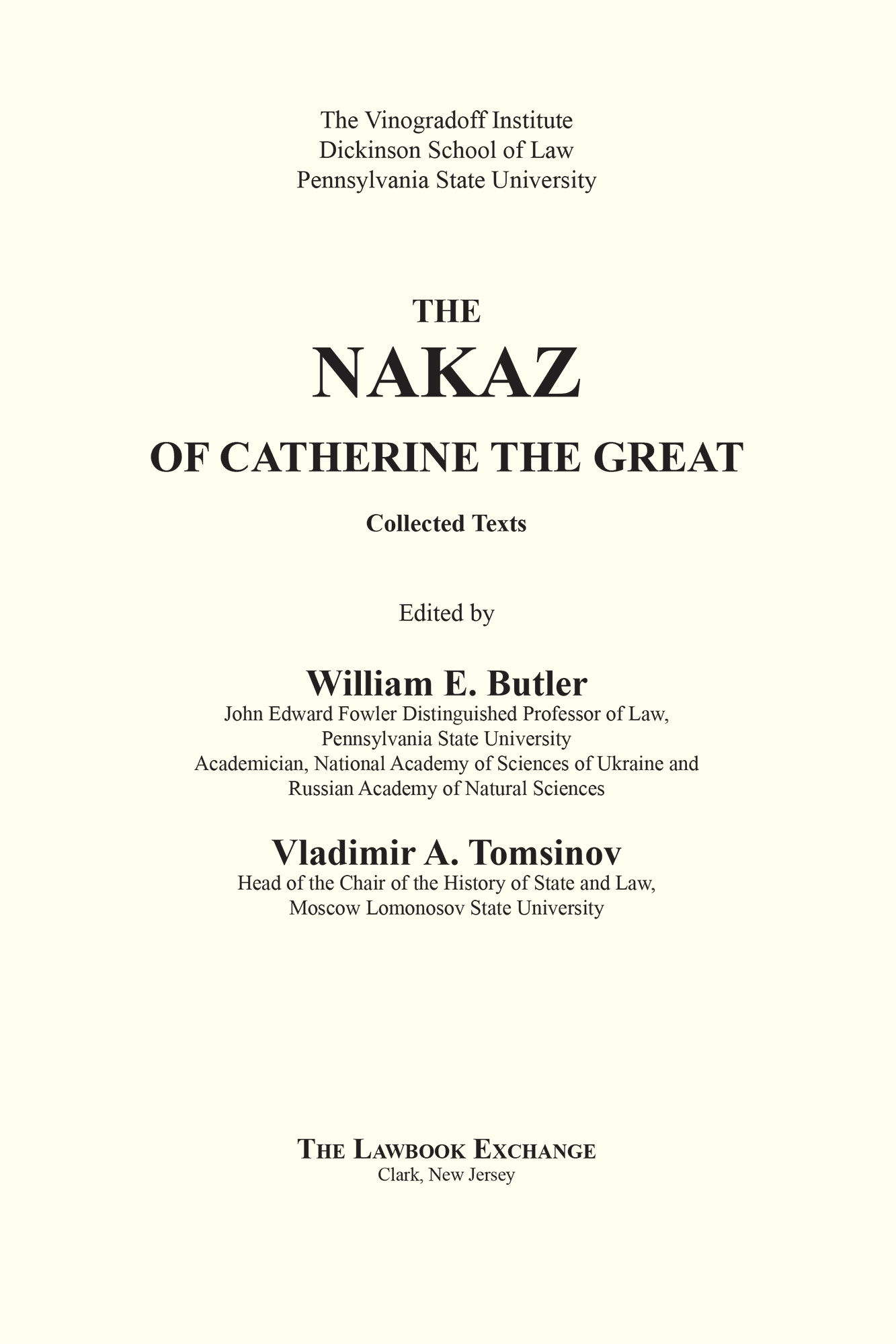 2010. ISBN-13: 9781584779926; ISBN-10: 1584779926. A New Five Language Edition of the Nakaz By William E. Butler and Vladimir A. Tomsinov Butler, William E., and Vladimir A. Tomsinov, Editors. The Nakaz of Catherine the Great: Collected Texts. Clark: The Lawbook Exchange, Ltd. 2010. x, [11]-531 pp. ISBN-13: 9781584779926. ISBN-10: 1584779926. Hardcover. New. $59.95 * A major document of the Enlightenment, the Nakaz, or Instruction, composed by Catherine the Great served to guide the assembly summoned in 1766 to draft a new code of laws for the Russian Empire. Drawn from Montesquieu, Rousseau, and other Enlightenment thinkers, the Nakaz condemned torture and capital punishment and endorsed such principles as the equality of all before the law. Published in the principal European tongues, it proved to be a statement to the world as much as a practical legal text. The present edition contains the Russian, French, German, Latin, and two contemporary English translations, biographical notes, and a bibliography. William E. Butler is the John Edward Fowler Distinguished Professor of Law and Director of the Vinogradoff Institute at the Pennsylvania State University Dickinson School of Law and Emeritus Professor of Comparative Law at University College London; Academician of the National Academy of Sciences of Ukraine and the Russian Academy of Natural Sciences. Vladimir A. Tomsinov is the Head of the Chair of the History of State and Law, Moscow Lomonosov State University.