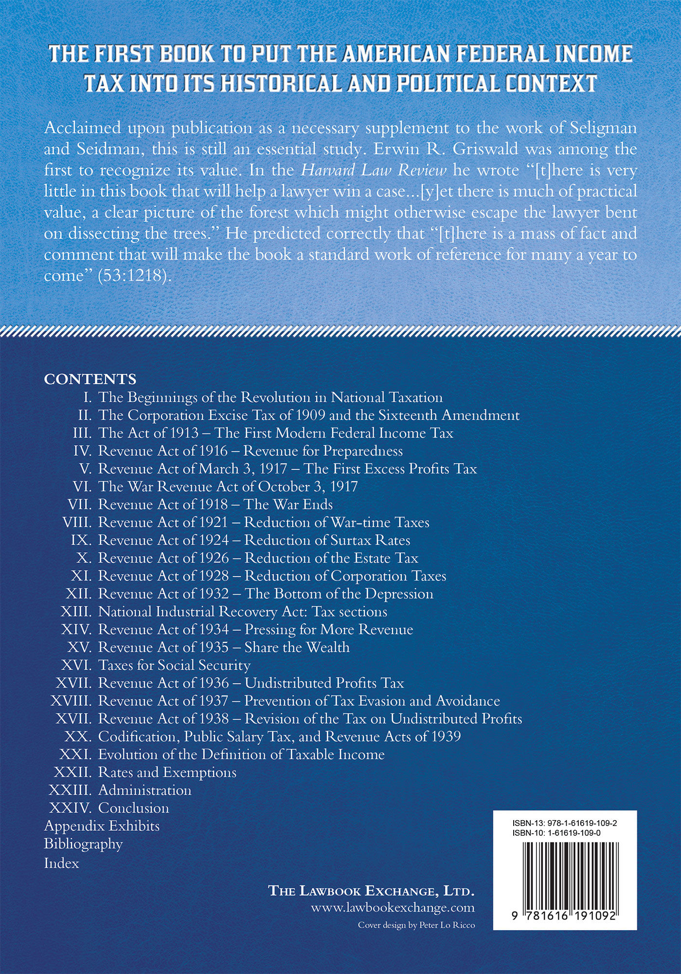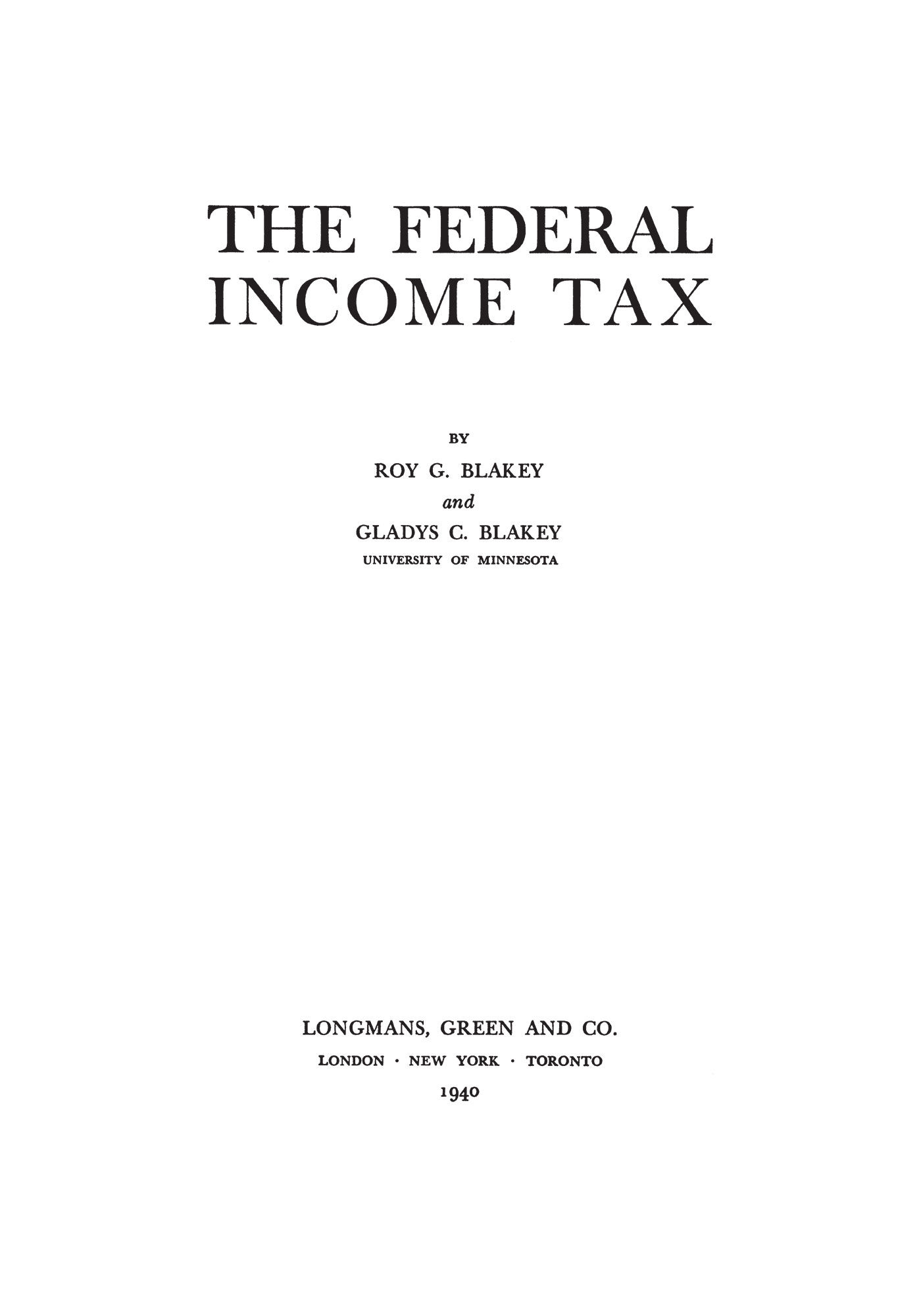 2010. ISBN-13: 9781616191092; ISBN-10: 1616191090. Blakey, Roy G., and Gladys McAlpine Campbell Blakey. The Federal Income Tax. Originally published: London, New York, Toronto: Longmans, Green and Co., 1940. xvii, [2] 640 pp. Tables. Diagrams (one fold-out). Reprinted 2010 by The Lawbook Exchange, Ltd. ISBN-13: 9781616191092; ISBN-10: 1616191090. Paperback. New. $59.95 * This was the first book to put the American federal income tax into its historical and political context. Acclaimed upon publication as a necessary supplement to the work of Seligman and Seidman, it is still an essential work. Erwin R. Griswald was among the first to recognize this book's value. In the Harvard Law Review he wrote "[t]here is very little in this book that will help a lawyer win a case...[y]et there is much of practical value, a clear picture of the forest which might otherwise escape the lawyer bent on dissecting the trees." He predicted correctly that "[t]here is a mass of fact and comment that will make the book a standard work of reference for many a year to come" (53:1218).