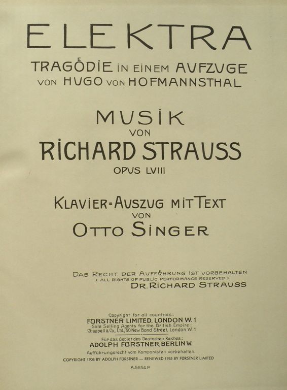 [Op. 58]. Elektra Tragödie in einem Aufzuge von Hugo von Hofmannsthal ... Klavier-Auszug mit Text von Otto Singer. [Piano-vocal score]