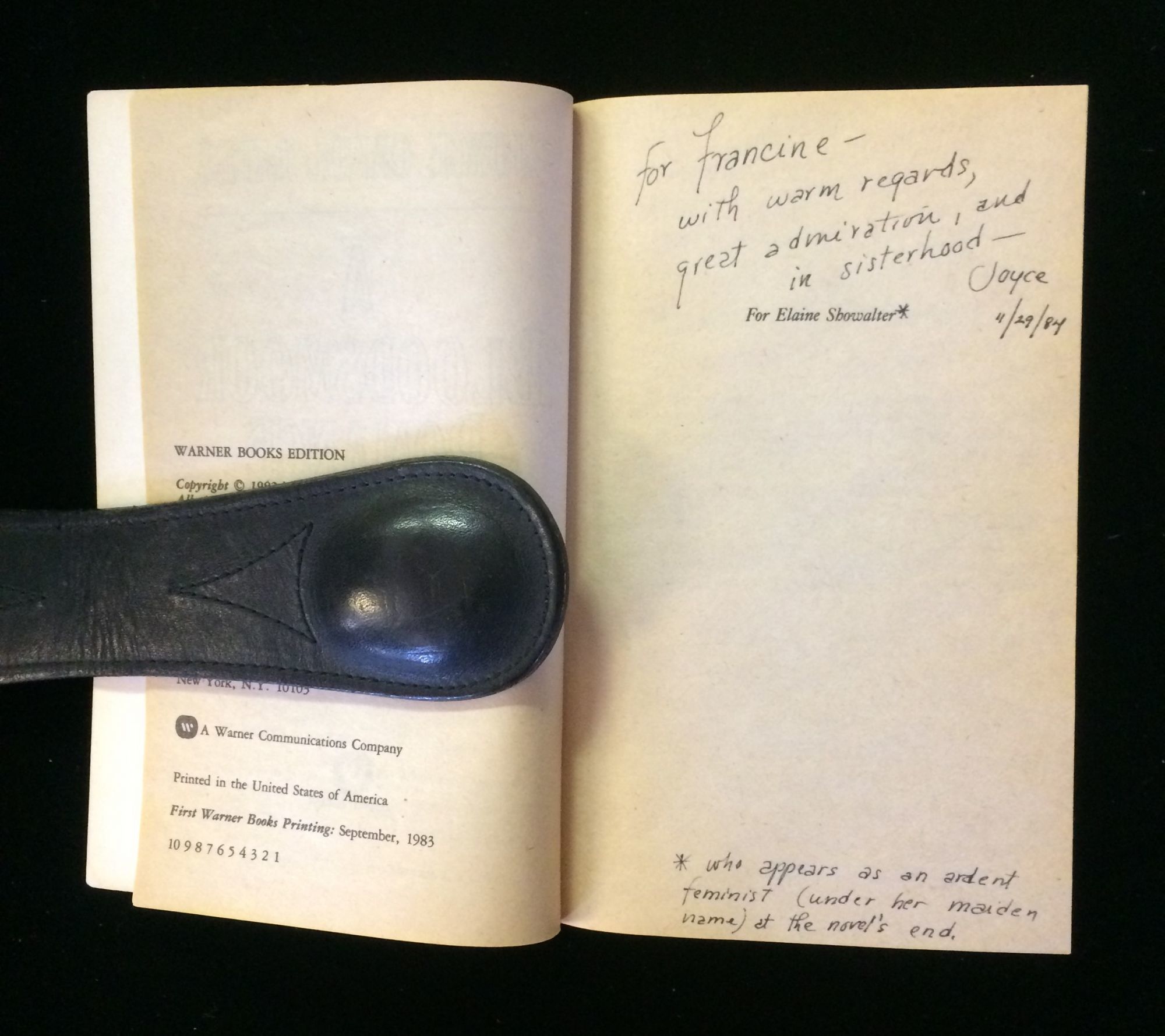 New York: Warner Books, 1983. First Paperback Printing. Soft cover. Near Fine -. Literary feminists' association copy, inscribed by Oates at the dedication page to author Francine du Plessix Gray. Oates' note to Gray reveals that book's dedicatee, feminist and literary critic Elaine Showalter, is the basis for a feminist character in the book under Showalter's maiden name, Elaine Cottler. Lightly rubbed edges.