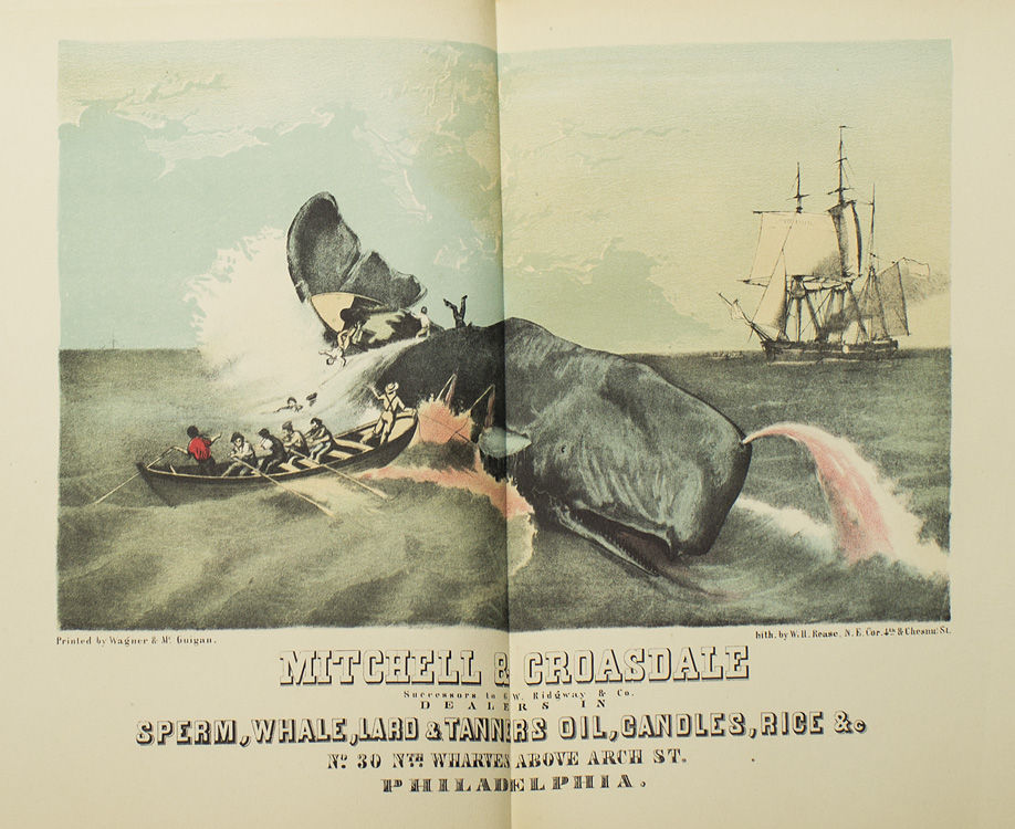New York: William Edwin Rudge, 1927. First Edition. One of 50 copies specially bound, with a double-page frontispiece color reproduction of a trade card for a Mitchell & Crosdale Philadelphia dealer in Sperm, Whale, Lard & Tanners Oils, Candes, Rice & c. of Whale killing. XLIV plates, uncut. 25 pages of text. 1 vols. 4to. Bound in quarter vellum and patterned boards. Very Fine in remains of original glassine. First Edition. One of 50 copies specially bound, with a double-page frontispiece color reproduction of a trade card for a Mitchell & Crosdale Philadelphia dealer in Sperm, Whale, Lard & Tanners Oils, Candes, Rice & c. of Whale killing. XLIV plates, uncut. 25 pages of text. 1 vols. 4to.