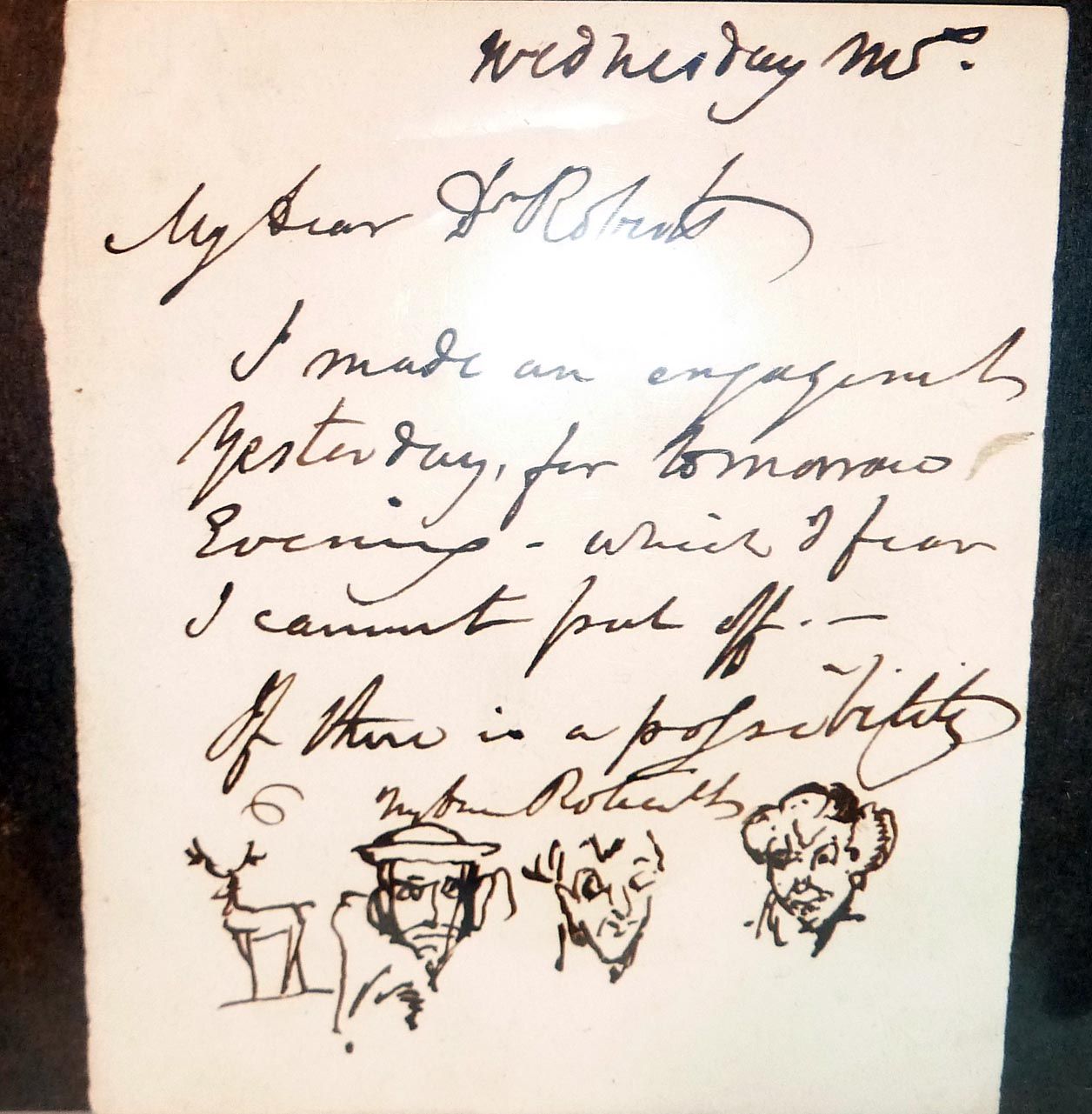 Np: Np, Nd. 1p, 3 3/4 x 4 1/2 inches. To Dr. Roberts, Wednesday [n.y.] -- "My dear Dr. Roberts. I made an engagement yesterday, for tomorrow evening which I fear I cannot put off." Darkly penned, with four drawings by Cruikshank with the same pen at bottom margin. Slightly irregular left edge where separated from integral leaf; else very good/fine.