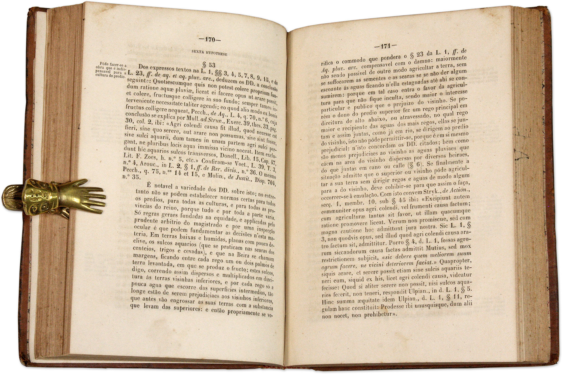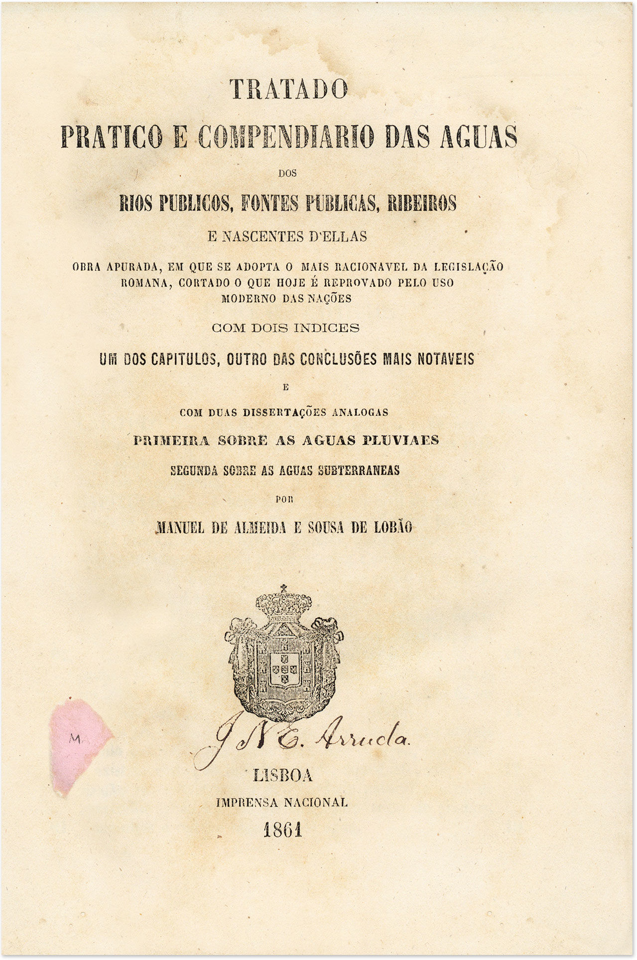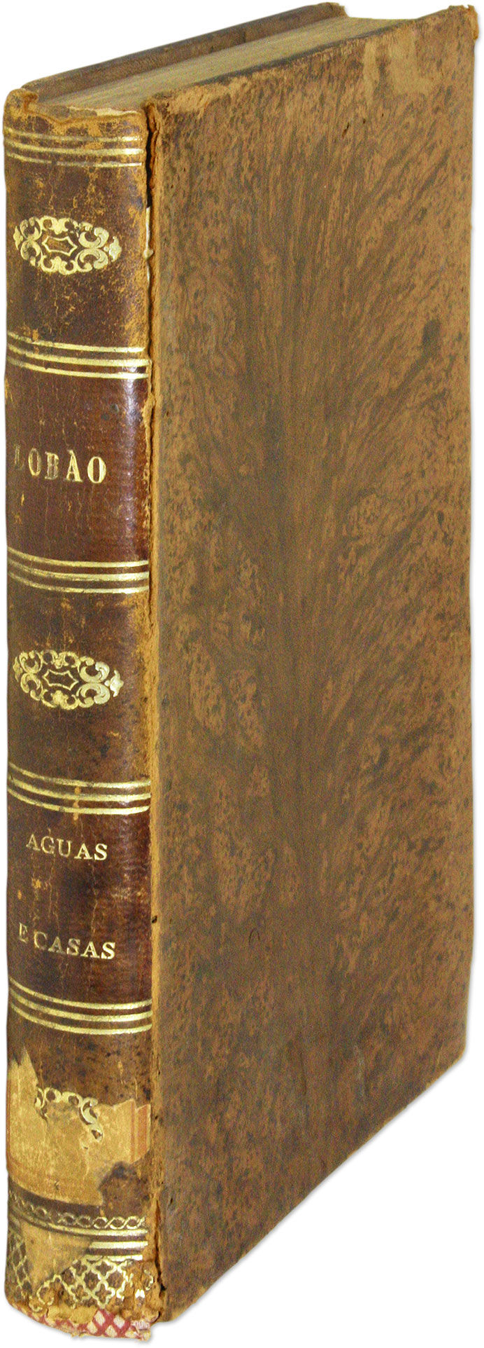 1861. Rare Portuguese Treatise on Water Law Almeida e Sousa de Lobao, Manuel de. Tratado Pratico e Compendiario das Aguas dos Rios Publicos, Fontes Publicas, Ribeiros e Nascentes d'Ellas: Obra Apurada, Em que se Adopta o Mais Racionavel da Legislacao Romana, Cortado o que Hoje e Reprovado Pelo uso Moderno das Nacoes. Com Dois Indices, Um dos Capitulos, Outro das Conclusoes mais Notaveis e com Duas Dissertacoes Analogas Primeira Sobre as Aguas Pluviaes Segunda Sobre as Aguas Subterraneas. Lisbon: Imprensa Nacional, 1861. xxiv, 195 pp. Octavo (8" x 5-1/2"). Contemporary sheep treated to look like tree calf, lettering pieces and gilt ornaments to spine, marbled endpapers. A few shallow scuffs to boards, some rubbing to extremities with wear to spine ends and corners, front joint starting at ends, boards somewhat bowed, rear hinge cracked but secure, small worm hole to front free endpaper and title page. Some toning to text, light foxing to a few leaves. Early owner name to title page and fore-edge of text block, "J N E. Arruda", internally clean. Ex-library. Fragment of shelf label to spine, fragment of bookplate to front free endpaper. A solid copy of a rare title. $650. * This appears to have been a respected work. It was cited by jurists in Portugal and Brazil and reprinted in 1911. It is quite rare today, however. OCLC locates one copy in North America (at Yale Law School). Other copies located at UC-Berkeley Law School and Harvard Law School, which has the 1911 edition. Not in the British Museum Catalogue.
