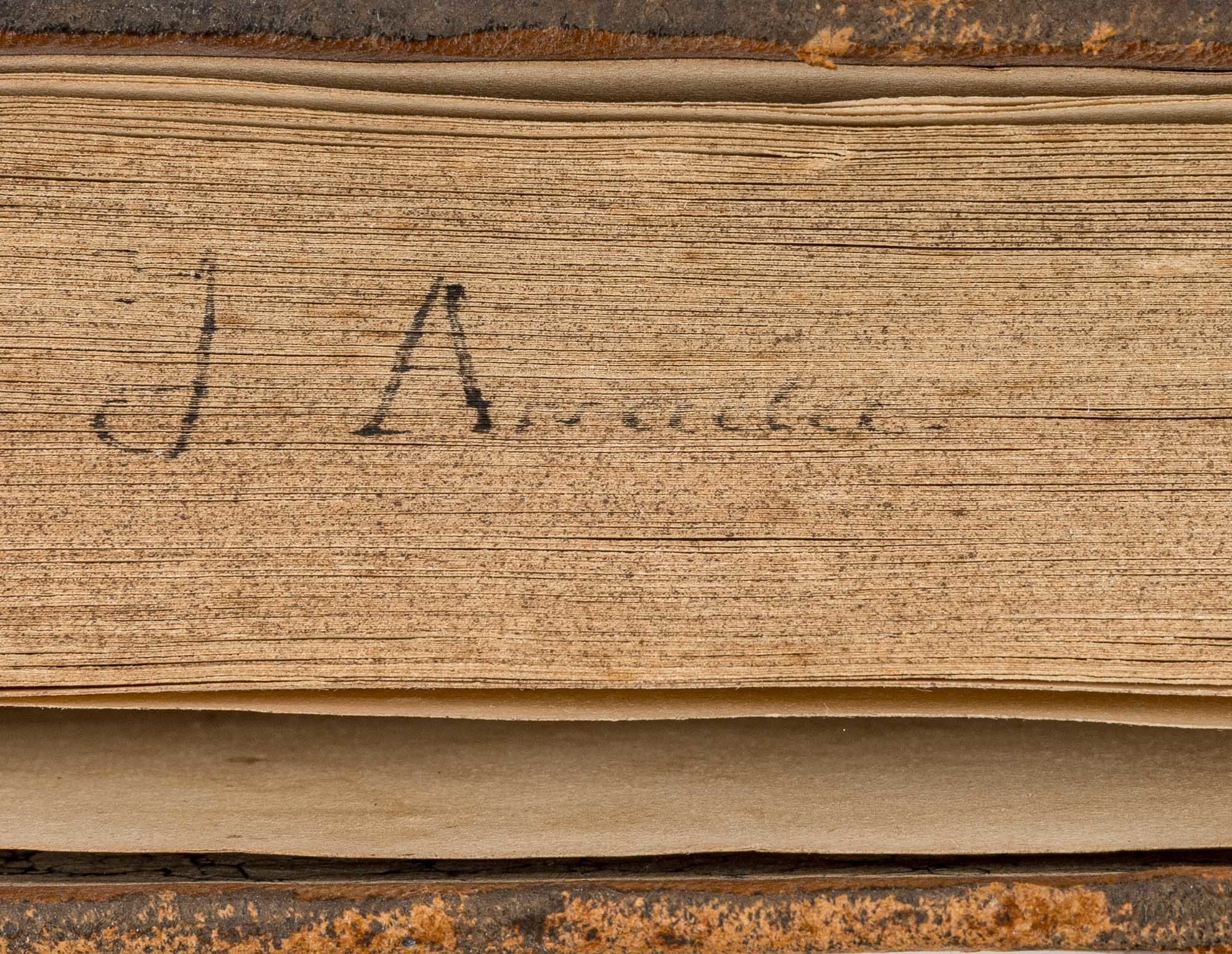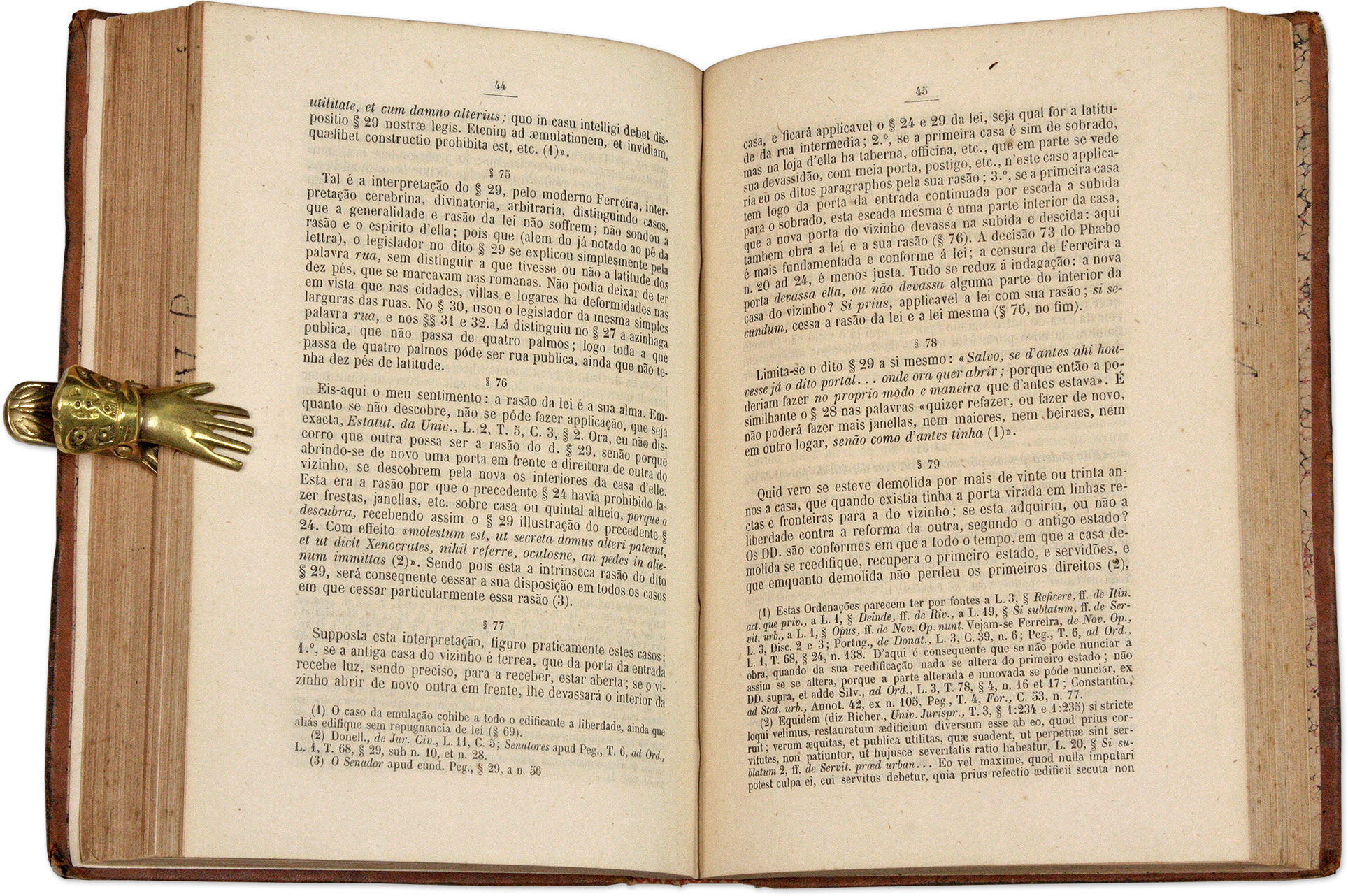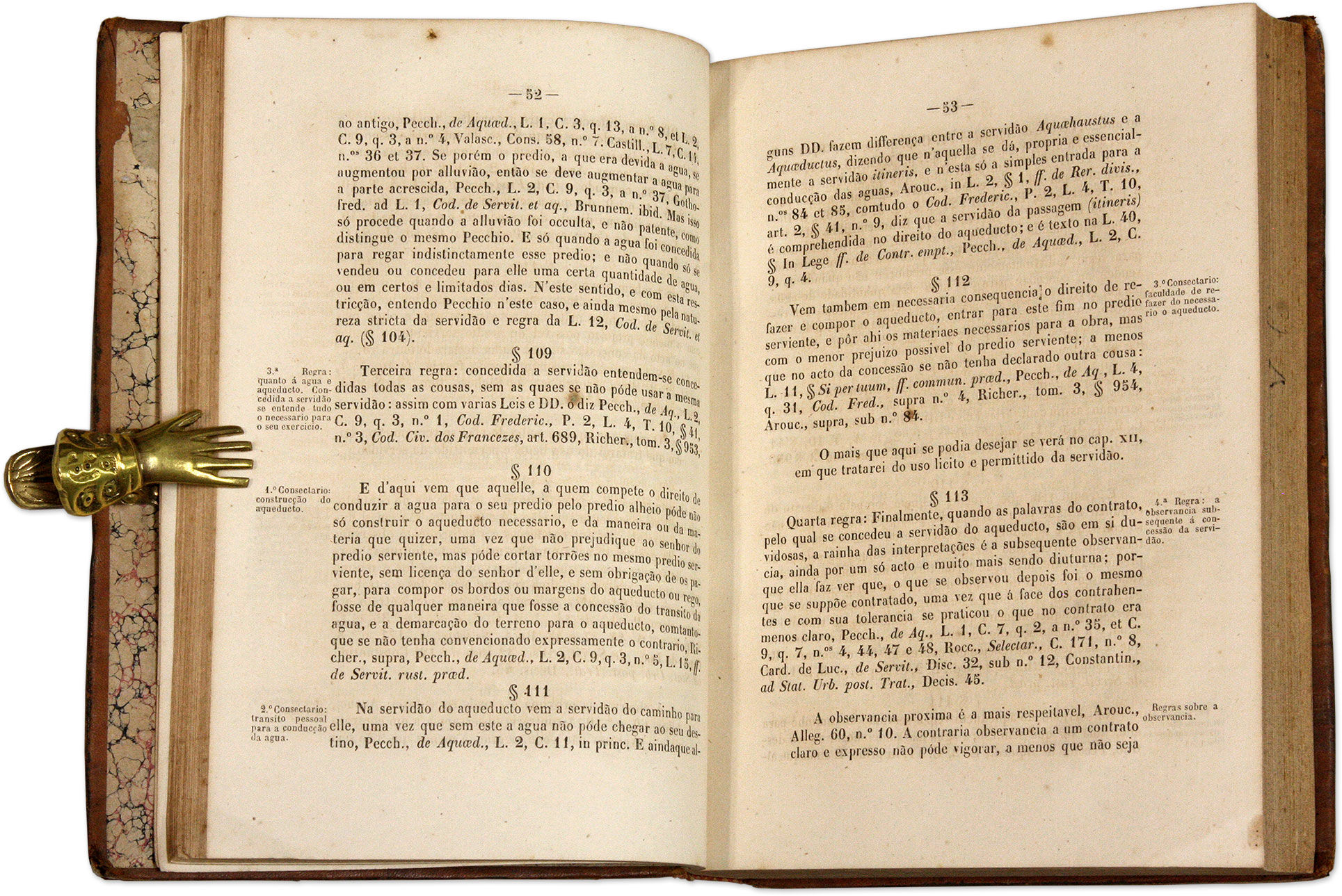 1861. Rare Portuguese Treatise on Water Law Almeida e Sousa de Lobao, Manuel de. Tratado Pratico e Compendiario das Aguas dos Rios Publicos, Fontes Publicas, Ribeiros e Nascentes d'Ellas: Obra Apurada, Em que se Adopta o Mais Racionavel da Legislacao Romana, Cortado o que Hoje e Reprovado Pelo uso Moderno das Nacoes. Com Dois Indices, Um dos Capitulos, Outro das Conclusoes mais Notaveis e com Duas Dissertacoes Analogas Primeira Sobre as Aguas Pluviaes Segunda Sobre as Aguas Subterraneas. Lisbon: Imprensa Nacional, 1861. xxiv, 195 pp. Octavo (8" x 5-1/2"). Contemporary sheep treated to look like tree calf, lettering pieces and gilt ornaments to spine, marbled endpapers. A few shallow scuffs to boards, some rubbing to extremities with wear to spine ends and corners, front joint starting at ends, boards somewhat bowed, rear hinge cracked but secure, small worm hole to front free endpaper and title page. Some toning to text, light foxing to a few leaves. Early owner name to title page and fore-edge of text block, "J N E. Arruda", internally clean. Ex-library. Fragment of shelf label to spine, fragment of bookplate to front free endpaper. A solid copy of a rare title. $650. * This appears to have been a respected work. It was cited by jurists in Portugal and Brazil and reprinted in 1911. It is quite rare today, however. OCLC locates one copy in North America (at Yale Law School). Other copies located at UC-Berkeley Law School and Harvard Law School, which has the 1911 edition. Not in the British Museum Catalogue.