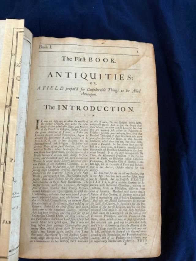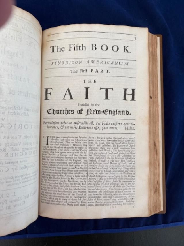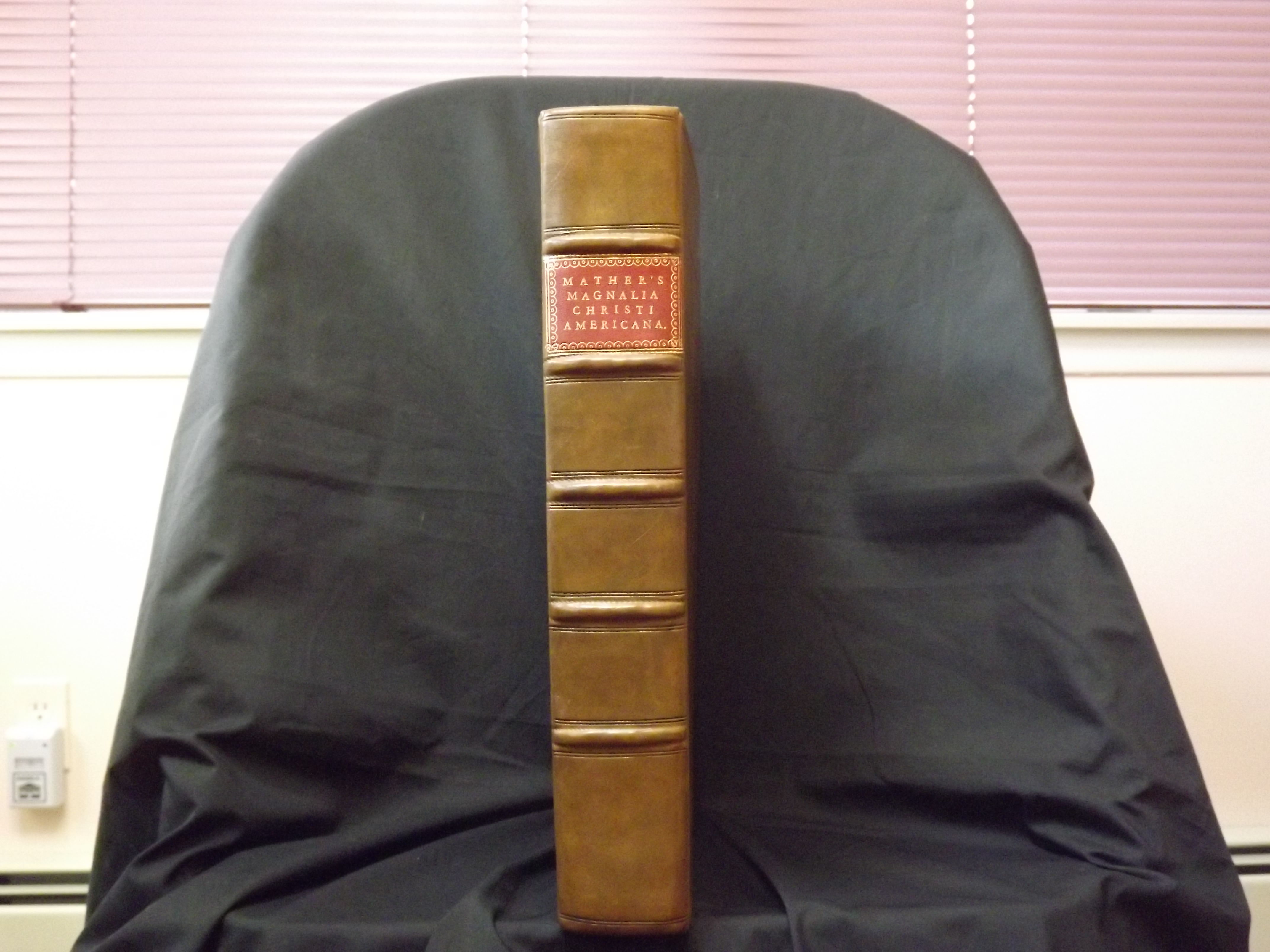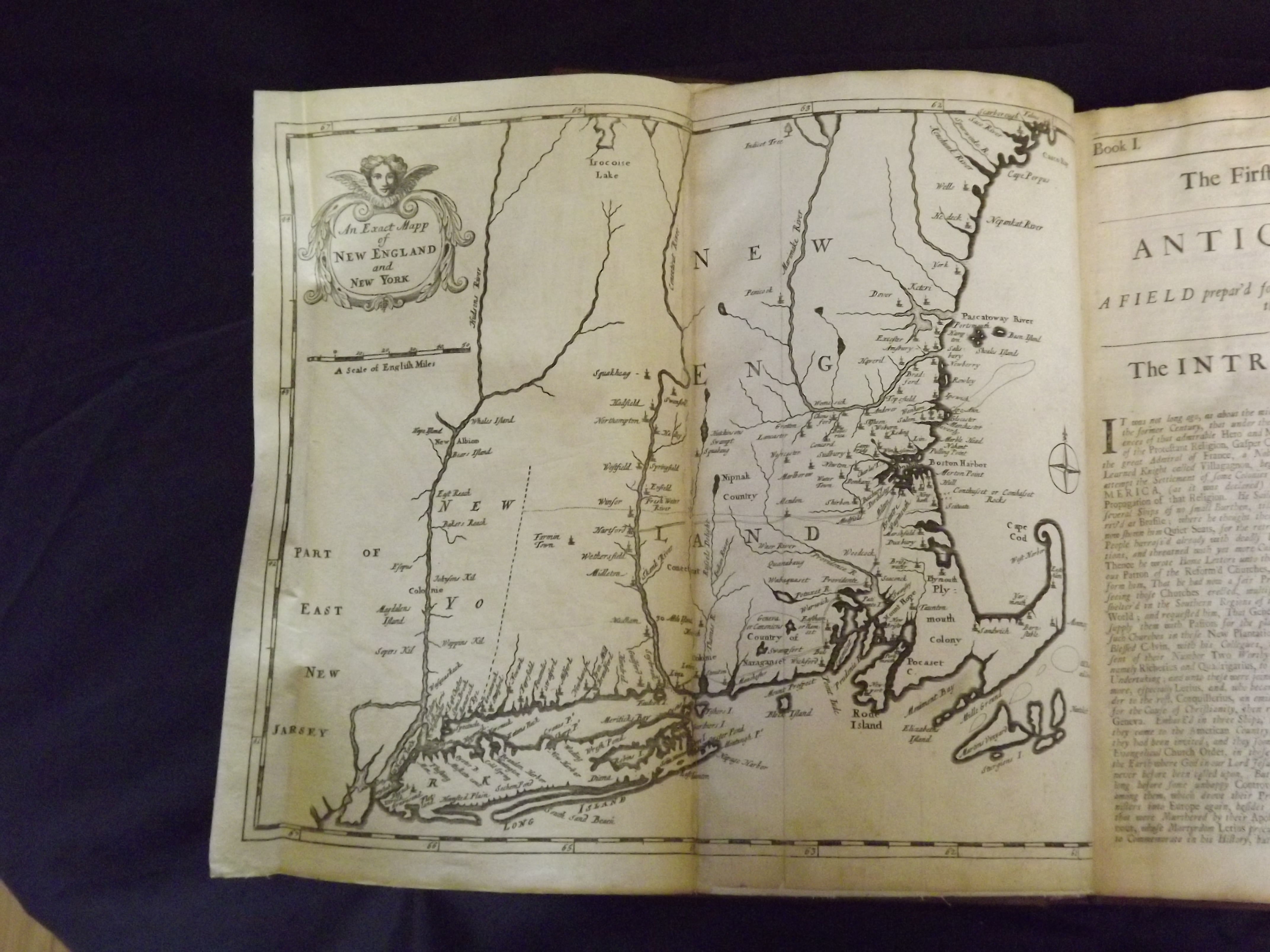 Folio, recently rebound in calf, consists of 7 books in one volume, folding map (linen-backed), [30], map, 38, [2], 75, 238, [2], 128-222, 100, 88, 118, [4] pp. As usual, lacking errata leaves, and first two blanks, left half of map made up in facsimile, first signature A (AN ATTESTATION, which should be bound after the title page is placed before the map) is bound incorrectly after D (per Church and Holmes). All preliminaries are present. Minor marginal annotations, dampstaining affecting upper inner quarter of the first three books, some chips and folds in corners, occasional soiling, and wax remnant on title, leaves 6L2 and 6L3 with smaller margins, apparently taken from another copy. First ad leaf out of register and trim, the other worn and extended at the inner margin, both with slight loss of text. Handsomely rebound in full panel calf, sewn endbands, title label on spine. The first edition of Cotton Mather's (1663-1728) Magnalia Christi Americana has long been regarded as the most famous work produced during the colonial period. It contains a wealth of information on a broad range of subjects, and gives the reader a clear picture of colonial life. Of particular interest is his discussion of the Salem Witch trails, for which he challenges some of the methods used, and seems to be distancing himself from those events. Some historians would argue he played a not insignificant role in what happened in Salem. Other highlights include his discussion of the development of Harvard College, and the escape of Hannah Duston (1657-1736) from the Indians. Extra postage may be required.