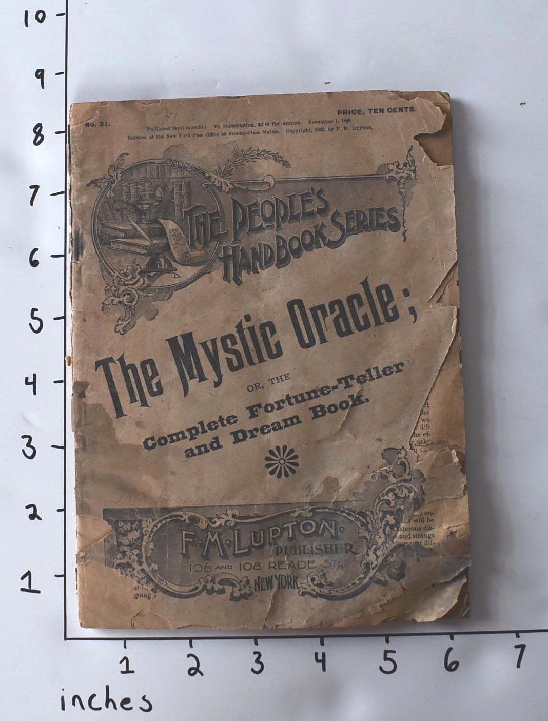 New York: F. M. Lupton, 1893. Softbound. Fair cover sheets and pages are stained, ripped and has a little bit of loss. About 9 of the last sheets are dog-eared at the lower corner. This item is inherently fragile and does not suffer handling well. An item of historical significance which might be an excellent candidate for digitization.. Fragile brownish paper wraps. 56 pp., (8 blank pp.), several tables. One long-lost competitor to "Aunt Sally's" was "The Mystic Oracle; or The Complete Fortune-Teller and Dream Book," published in 1893 as #21 in "The People's Handbook Series" by F. M. Lupton of New York. In a mere 56 pages, this pamphlet not only encompasses Oneirology (divination by dreams) and The French Oraculum or Book of Fate, but it also explains the secrets of Zodiceology (divination of lucky and unlucky days and hours); Palmistry; Naeviology (foretelling by moles, marks, and scars); Physiognomy (foretelling from hair and features); Cardiology (foretelling by cards, dice, and dominoes); Charms, Spells, and Incantations! The last item in this pamphlet is the Oraclum. Apparently there were several editions of this pamphlet, as a copy in Dickinson College claims to be incomplete, ending with the dream topic of "leaping" on page 30. This copy contains that entry at the end of the first column on page 42. Extremely rare.