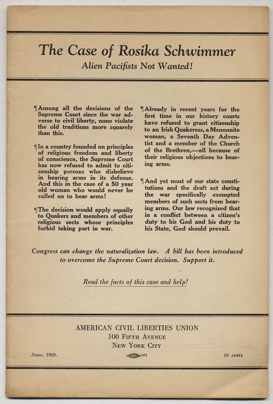 New York: American Civil Liberties Union, 1929. Softcover. Very Good. First edition. Octavo. 16pp. Stapled self-wrappers. A bit of age-toning on the wrappers, corners a trifle bumped, a very good copy. Story of a Hungarian pacifist denied American citizenship.