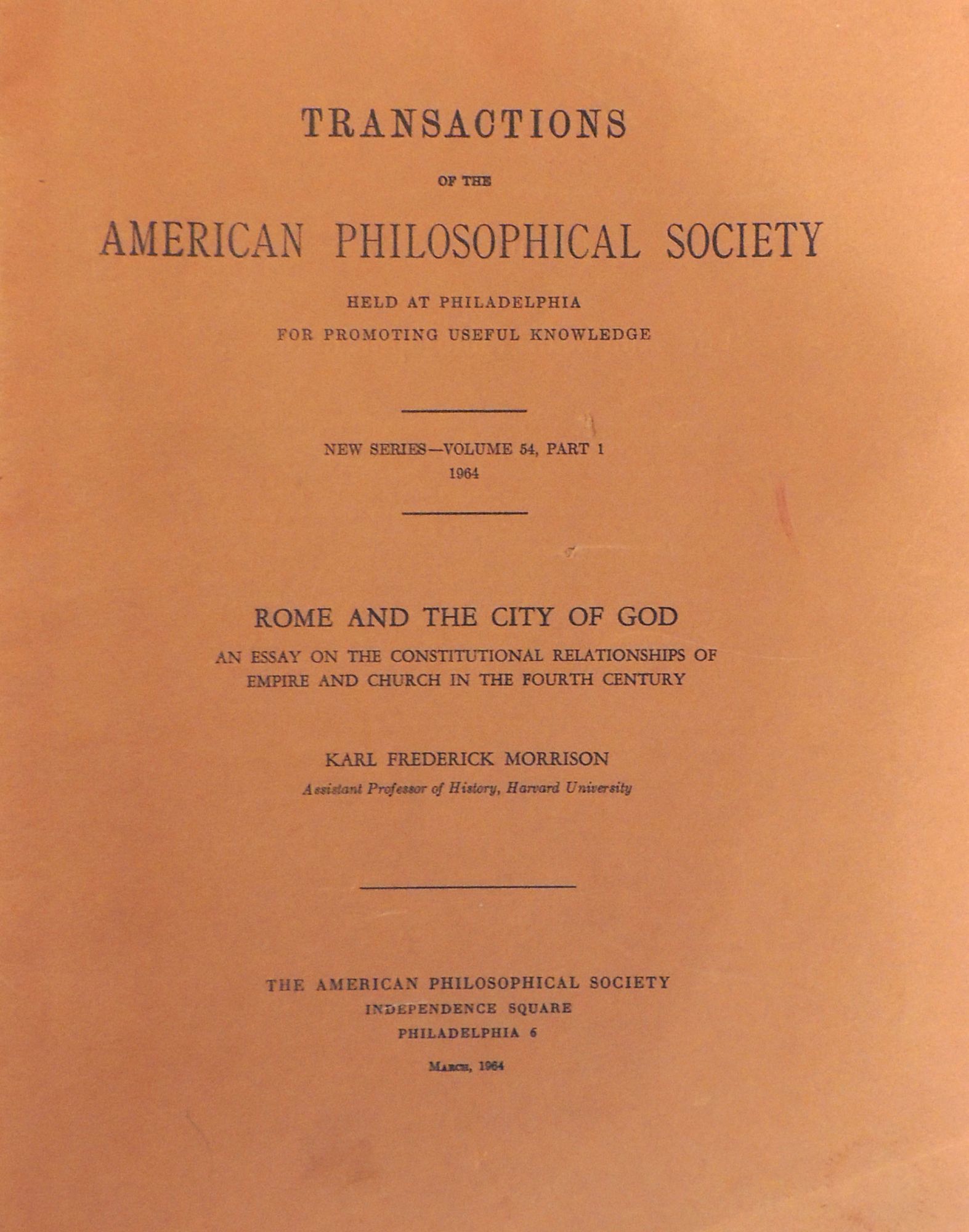 Transactions of the American Philosophical Society Helt at Philadelphia for Promoting Useful Knowledge, New Series - Volume 54, Part 1, 1964: Rome and the City of God, An Essay on the Consitutional Relationshipsof Empire and Church in the Fourth Century
