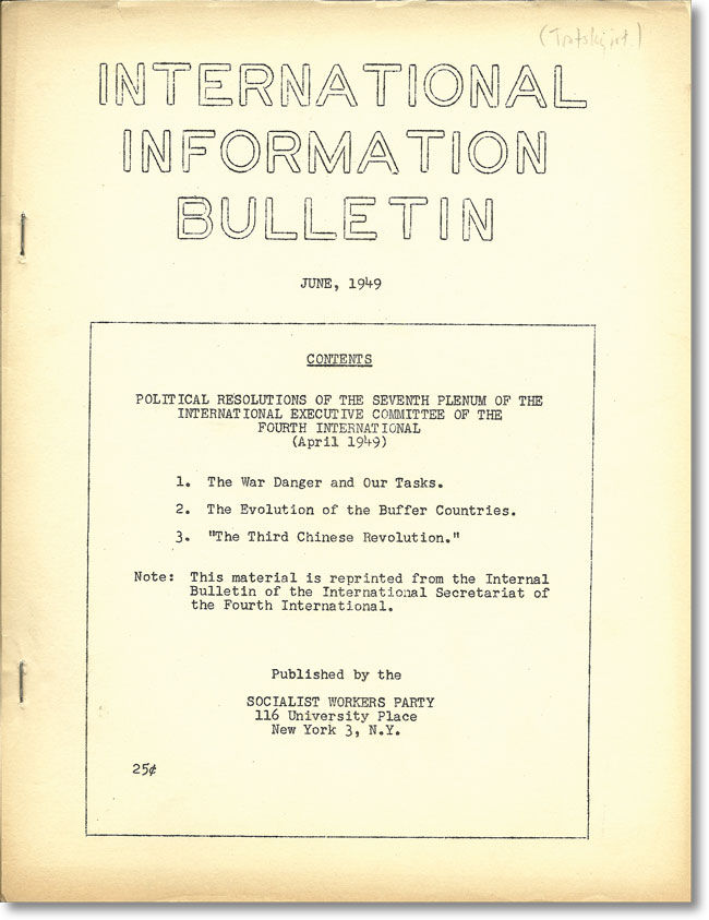 New York: Socialist Workers Party, 1949. First Edition. Quarto (11" x 8-1/2"). Staple-bound, mimeographed sheets; 35pp. Final leaf partially detached; minor browning to text, else Very Good. Official organ of the Socialist Workers Party, the Trotskyist offshoot of the American Socialist Party. This issue reprints Political Resolutions of the Seventh Plenum of the International Executive Committee of the Fourth International (April 1949).
