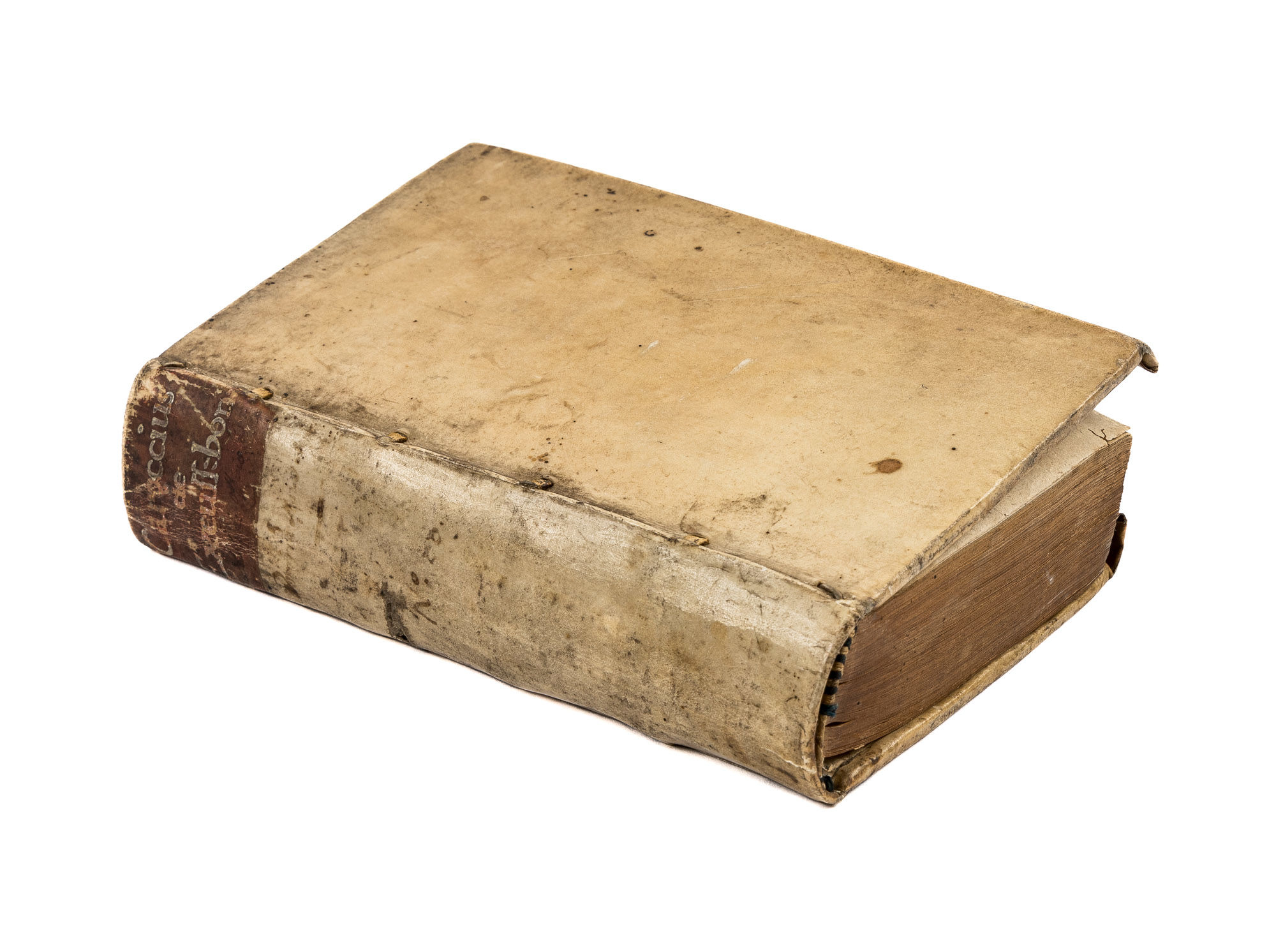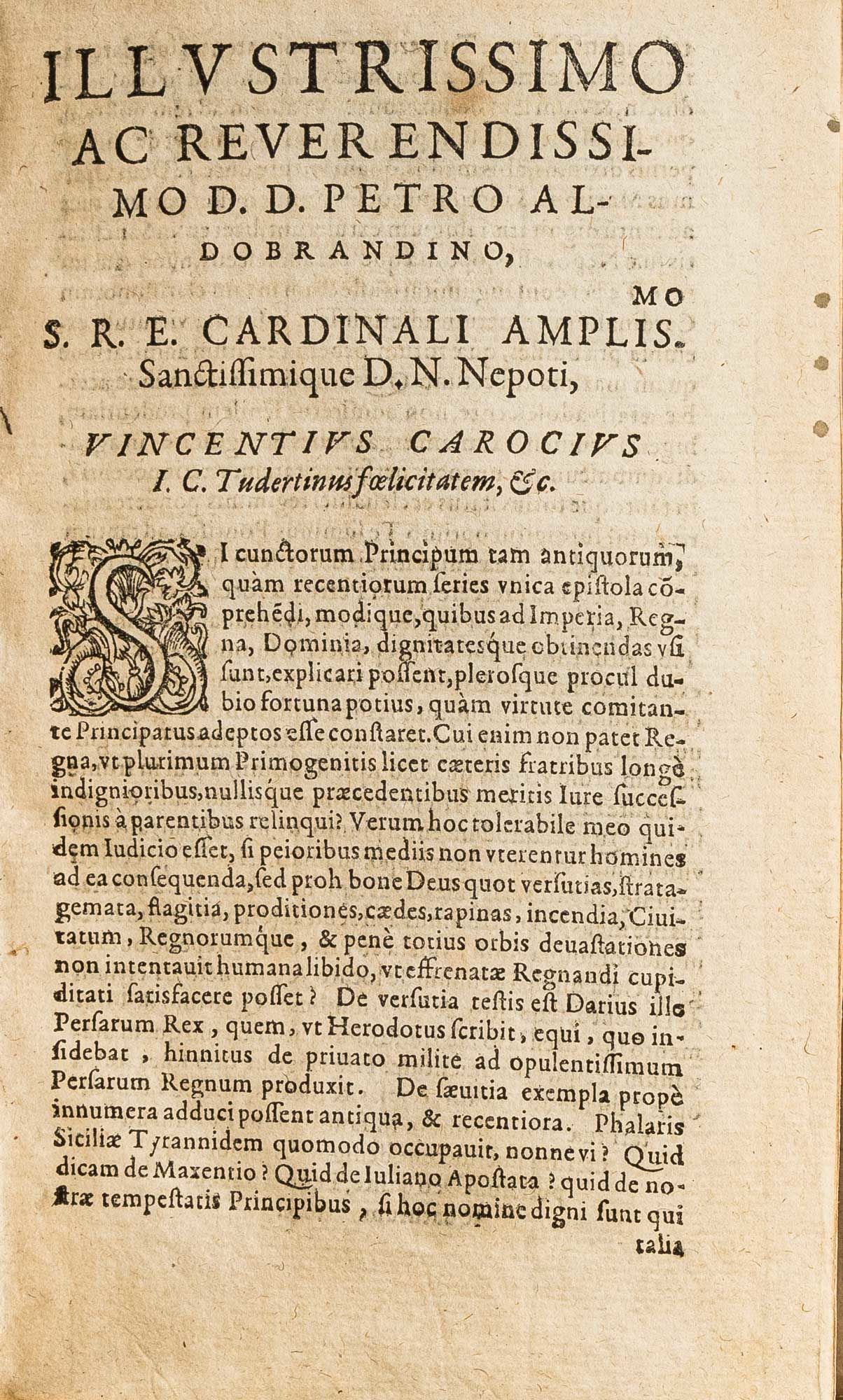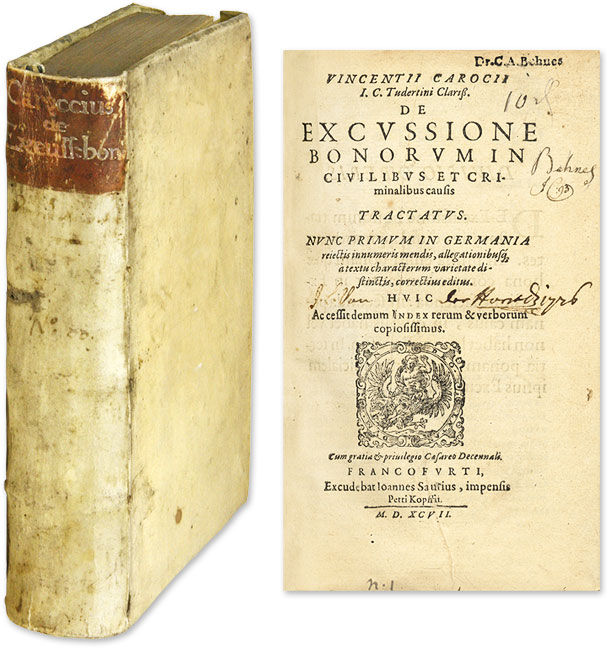 1597. Frankfurt, 1597. 1st German ed.. Frankfurt, 1597. 1st German ed. Claims and Liens Carocci, Vincenzo [fl. 1584]. De Excussione Bonorum in Civilibus et Criminalibus Causis Tractatus. Nunc Primum in Germania Reiectis Innumeris Mendis, Allegationibusque a Textu Characterum Varietate Distinctis, Correctius Editus. Frankfurt: Excudebat Ioannes Saurius, Impensis Petri Kopffii, 1597. [viii], 503, [70] pp. Octavo (5-3/4" x 4"). Contemporary vellum with yapp-style fore-edges, early hand-lettered title to spine. Some soiling and shelfwear, another short work removed from rear of volume. Woodcut printer devices to title and recto of final leaf, woodcut head and tail-pieces. Light toning to text, early owner signature and small later inkstamp to margins of title page, interior otherwise clean. $500. * First German edition, published the same year as the first Venice edition. Carocci discusses the Roman law dealing with priorities of claims and liens. According to the title, this edition corrects numerous inaccuracies of the Venice edition. It was published at the expense of Peter Kopff, a notary in Frankfurt. A second edition was published in Venice in 1603. All editions are scarce. OCLC locates 3 copies of the 1597 imprints in North American law libraries, 2 of the Venice (UC-Berkeley, University of Michigan), 1 of the Frankfurt (Harvard). Verzeichnis der im Deutschen Sprachbereich Erschienenen Drucke des 16. Jahrhunderts C1192.