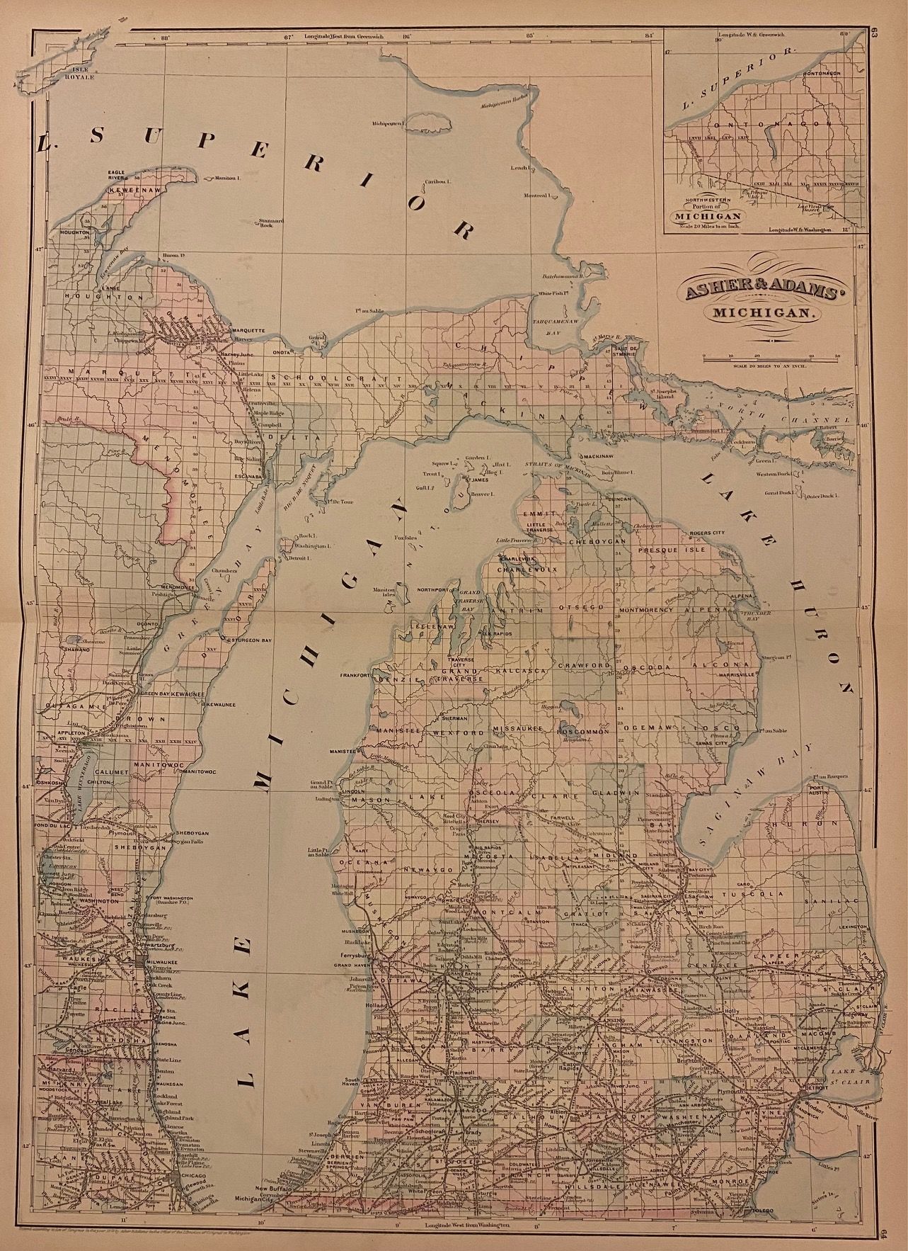 Great double page map of Michigan divided into counties and townships. Shows cities, major routes, railroads and waterways. Centered on Lake Michigan, the map includes parts of Lake Superior and Lake Huron, extending from Isle Royale in the northwest to the St. Clair River in the southeast. Features an inset showing the northwestern portion of Michigan (Ontonagon). Some toning but otherwise in very good condition.