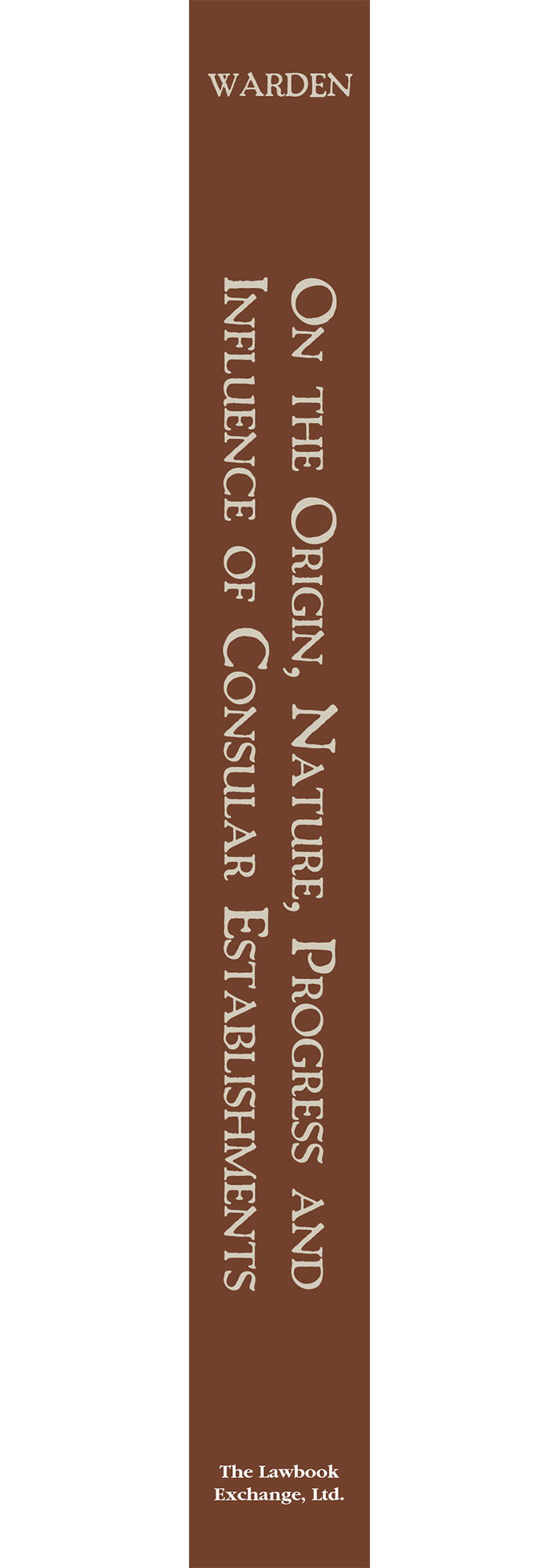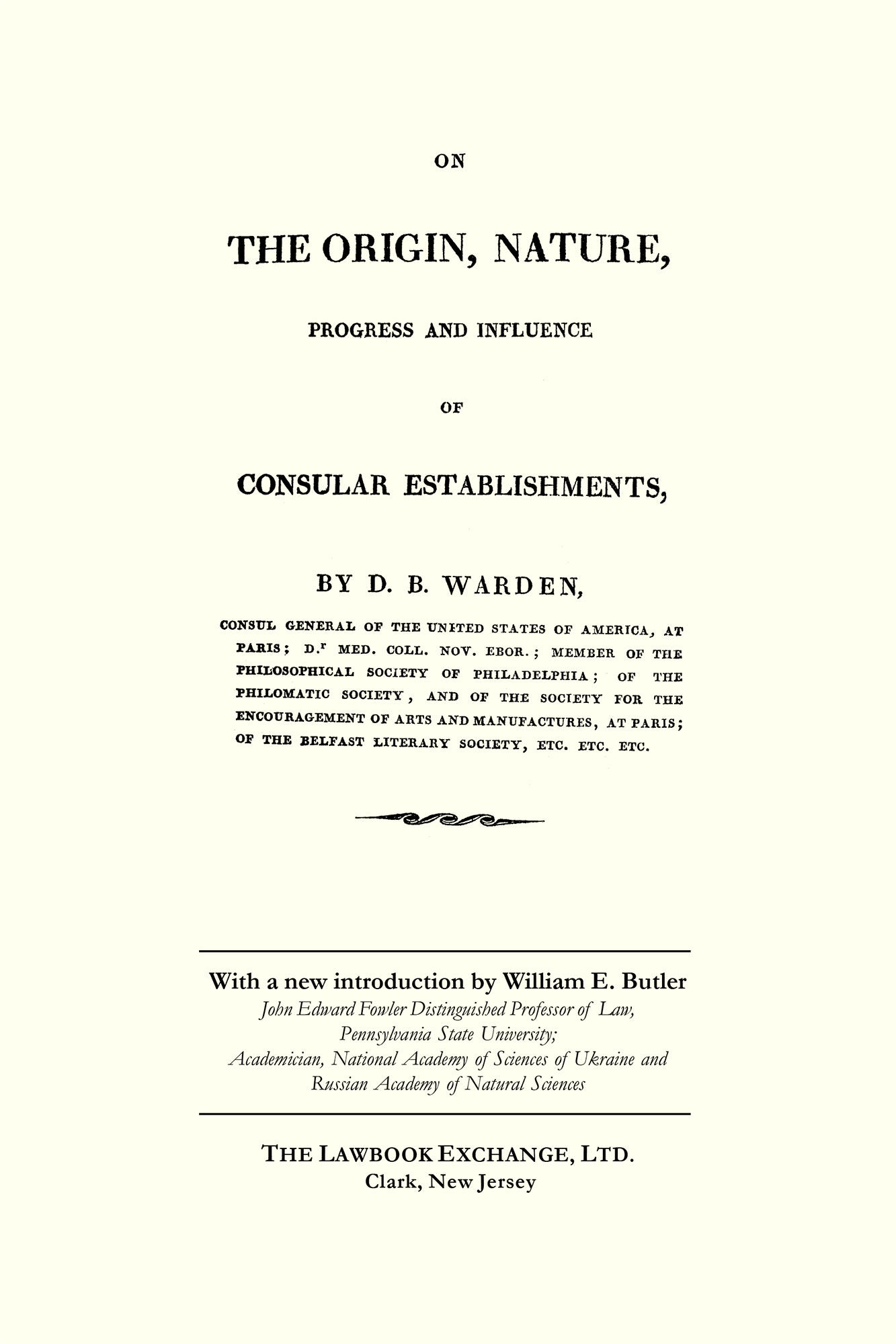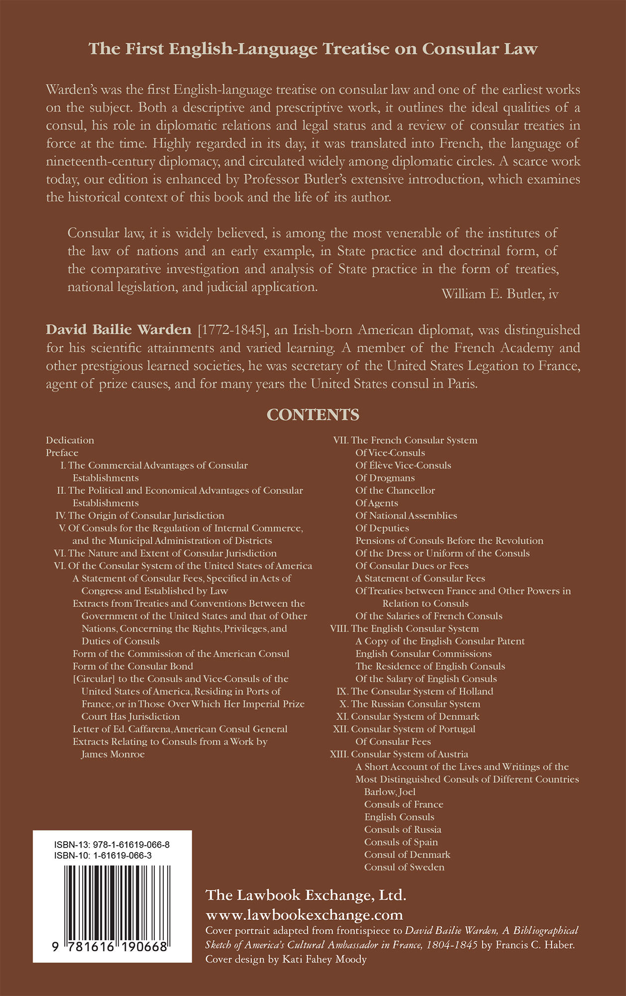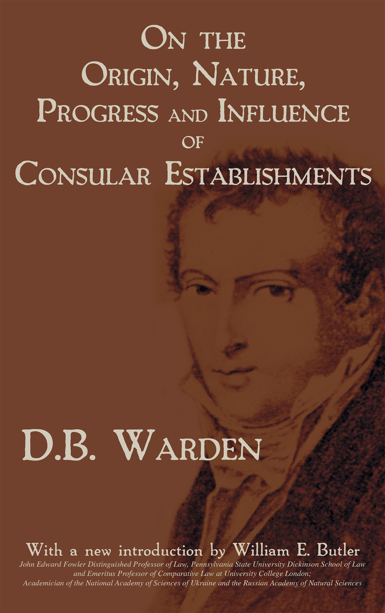 2011. ISBN-13: 9781616190668; ISBN-10: 1616190663. Warden, David B. William E. Butler, New Introduction. On the Origin, Nature, Progress and Influence of Consular Establishments. Originally published: Paris: Printed and sold by Smith, 1813. lxii, 331 pp. Reprinted by The Lawbook Exchange, Ltd. 2011. With a new introduction by William E. Butler, John Edward Fowler Distinguished Professor of Law and Director of the Vinogradoff Institute at the Pennsylvania State University Dickinson School of Law and Emeritus Professor of Comparative Law at University College London; Academician of the National Academy of Sciences of Ukraine and the Russian Academy of Natural Sciences. ISBN-13: 9781616190668. ISBN-10: 1616190663. Hardcover. New. $25.95 * Warden's was the first English-language treatise on consular law and one of the earliest works on the subject. Both a descriptive and prescriptive work, it outlines the ideal qualities of a consul, his role in diplomatic relations and legal status and a review of consular treaties in force at the time. Highly regarded in its day, it was translated into French, the language of nineteenth-century diplomacy, and circulated widely among diplomatic circles. A scarce work today, our edition is enhanced by Professor Butler's extensive introduction, which examines the historical context of this book and the life of its author. "Consular law, it is widely believed, is among the most venerable of the institutes of the law of nations and an early example, in State practice and doctrinal form, of the comparative investigation and analysis of State practice in the form of treaties, national legislation, and judicial application." --William E. Butler, iv David Bailie Warden [1772-1845], an Irish-born American diplomat, was distinguished for his scientific attainments and varied learning. A member of the French Academy and other prestigious learned societies, he was secretary of the United States Legation to France, agent of prize causes, and for many years the United States consul in Paris.