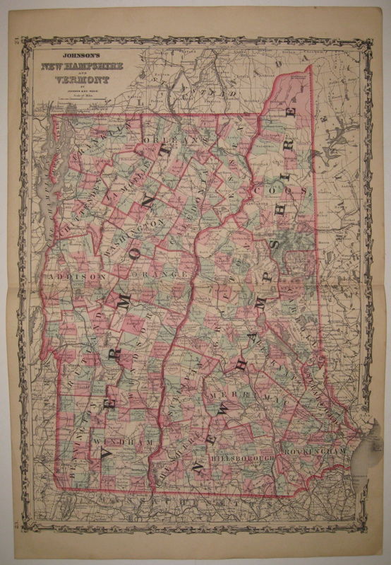 Bold double page map of New Hampshire and Vermont divided into counties and townships. Delineates towns, waterways, railroads and major routes. In excellent condition with light creasing to upper left and light scattered foxing to margins. Alvin Jewett Johnson (1827-1884) is one of the most prolific American publishers of the 19th century. He opened his own company in 1856 that produced atlases, maps and encyclopedias. The company made great maps based on those by J.H. Colton and Johnson produced a newly updated version every year up until the late 19th century.