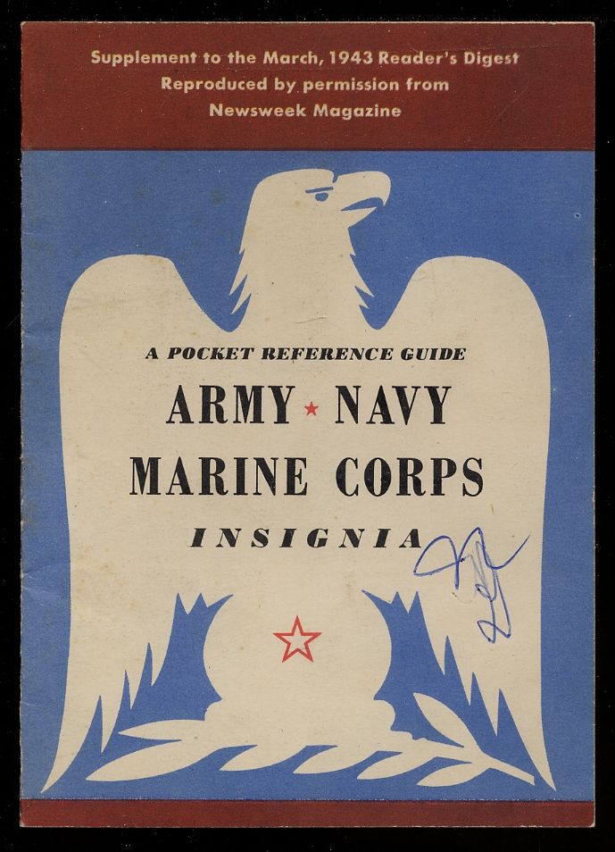 [New York]: Newsweek Magazine, 1943. Softcover. Near Fine. First edition. 11pp. Wrappers. Color illustrations. Very good with ink mark to cover. Pamphlet identifying the metals and insignia from the Army, Navy, and Marine corps. Supplement to the March, 1943 Reader's Digest reproduced by permission from Newsweek Magazine.