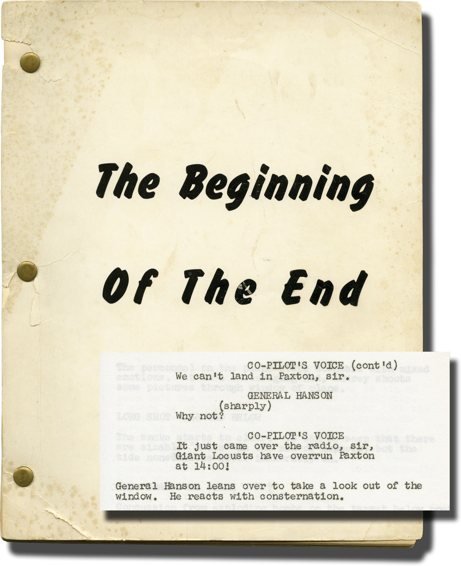 Los Angeles: Republic Pictures, 1957. Early Draft script for the 1957 film, "The Beginning of the End," directed by Bert I. Gordon, based on a story by Gordon (indicated here, though not credited in the film), written for the screen by Fred Freiberger and Lester Gorn, and starring Peter Graves and Peggie Castle.