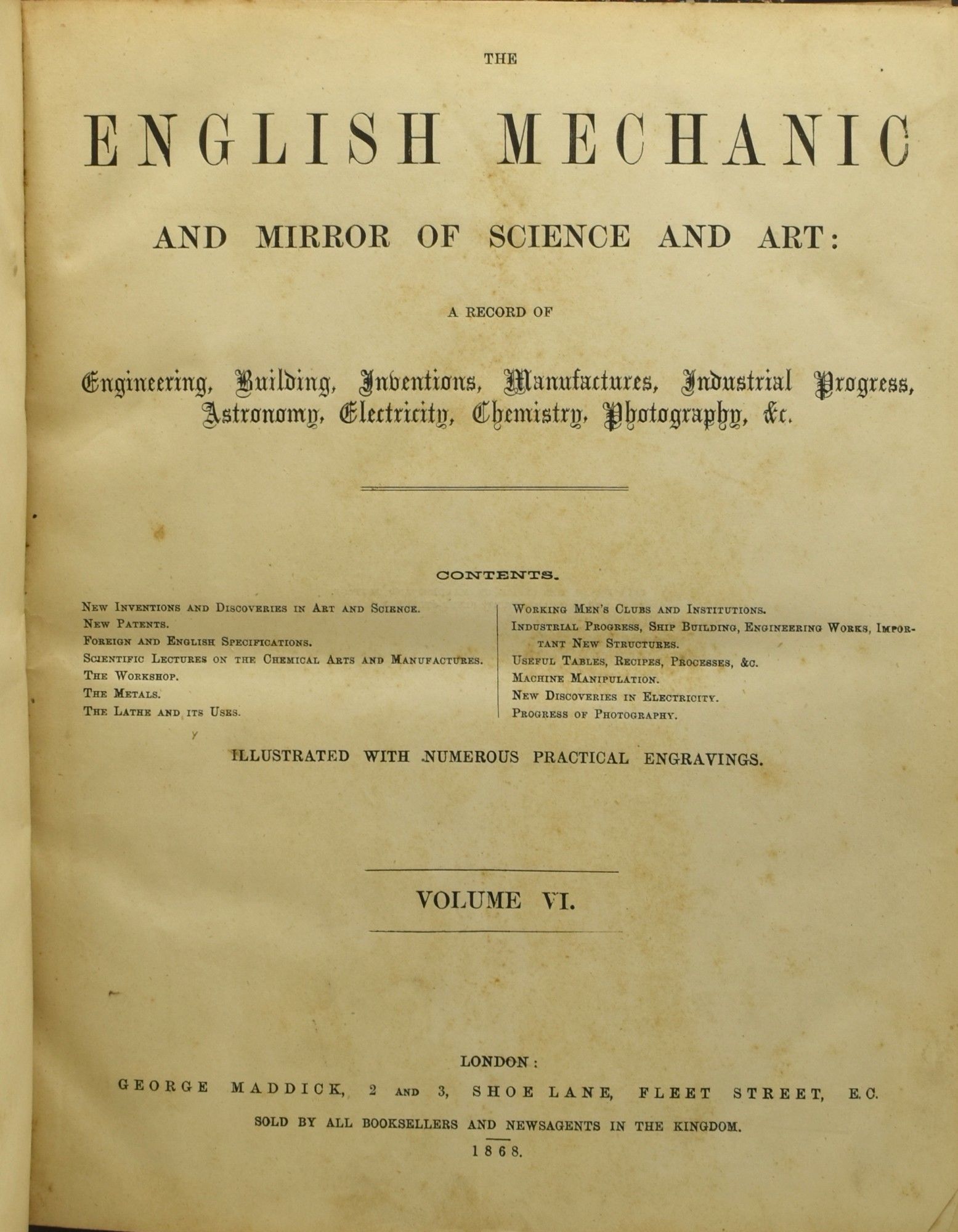 THE ENGLISH MECHANIC AND MIRROR OF SCIENCE AND ART: A RECORD OF ENGINEERING, BUILDING, INVENTIONS, MANUFACTURES, INDUSTRY PROGRESS, ELECTRICITY, PHOTOGRAPHY, CHEMISTRY, ASTRONOMY, &c. (Volume VI, No 131-156: September 27, 1867 - March 20, 1868)