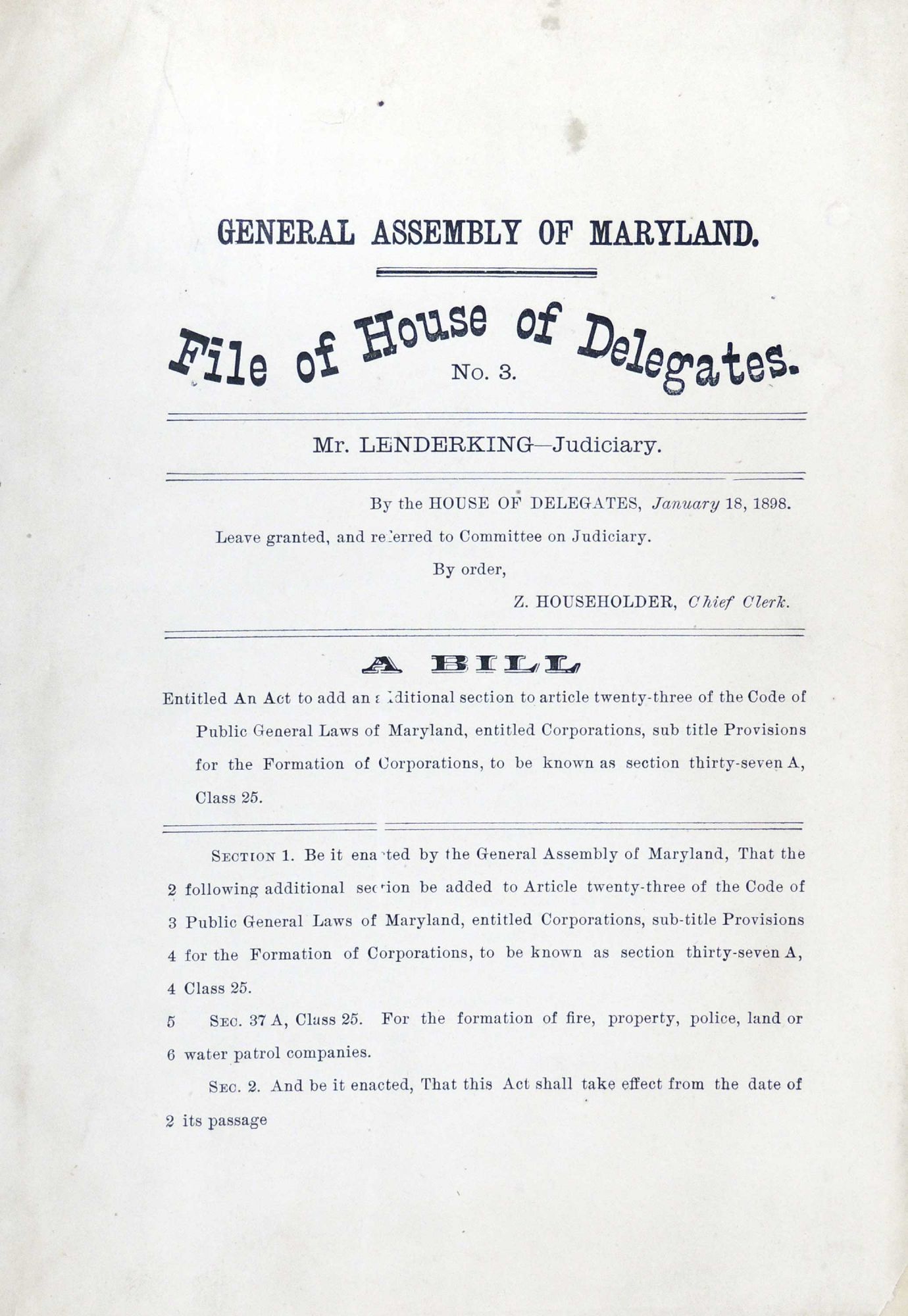 General Assembly of Maryland File of House of Delegates (Maryland House of Delegates- 1898)