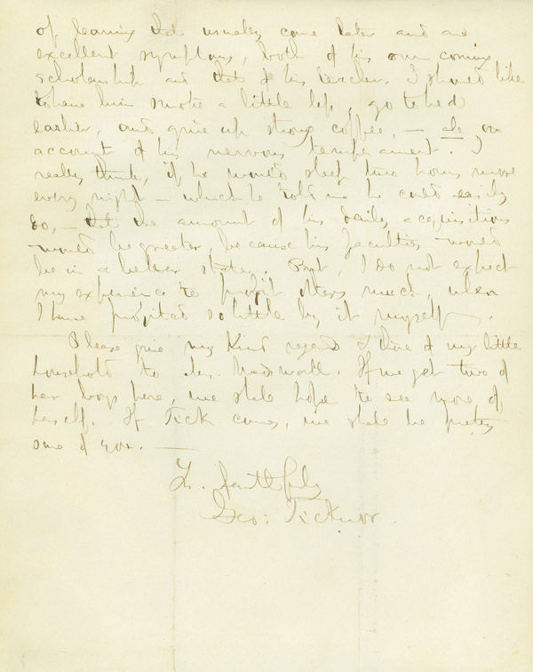 Autograph Letter, Signed (“Geo. Ticknor”) to Mr. [James S.] Wadsworth, concerning a place at school for Wadsworth’s son Charlie or “Tick”