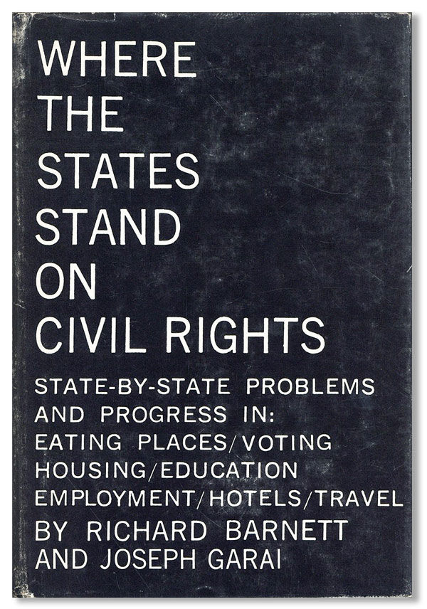 New York: Bold Face Books, 1962. First Edition. Octavo (22cm).Gray cloth boards; dustjacket; 160pp. Clean, tight copy, VG or better, in slightly rubbed and edgeworn dustwrapper. A state-by-state guide to "problems and progress in: eating places, voting, housing, education, employment, hotels, and travel." With a jacket blurb by James Farmer, National Director of CORE.