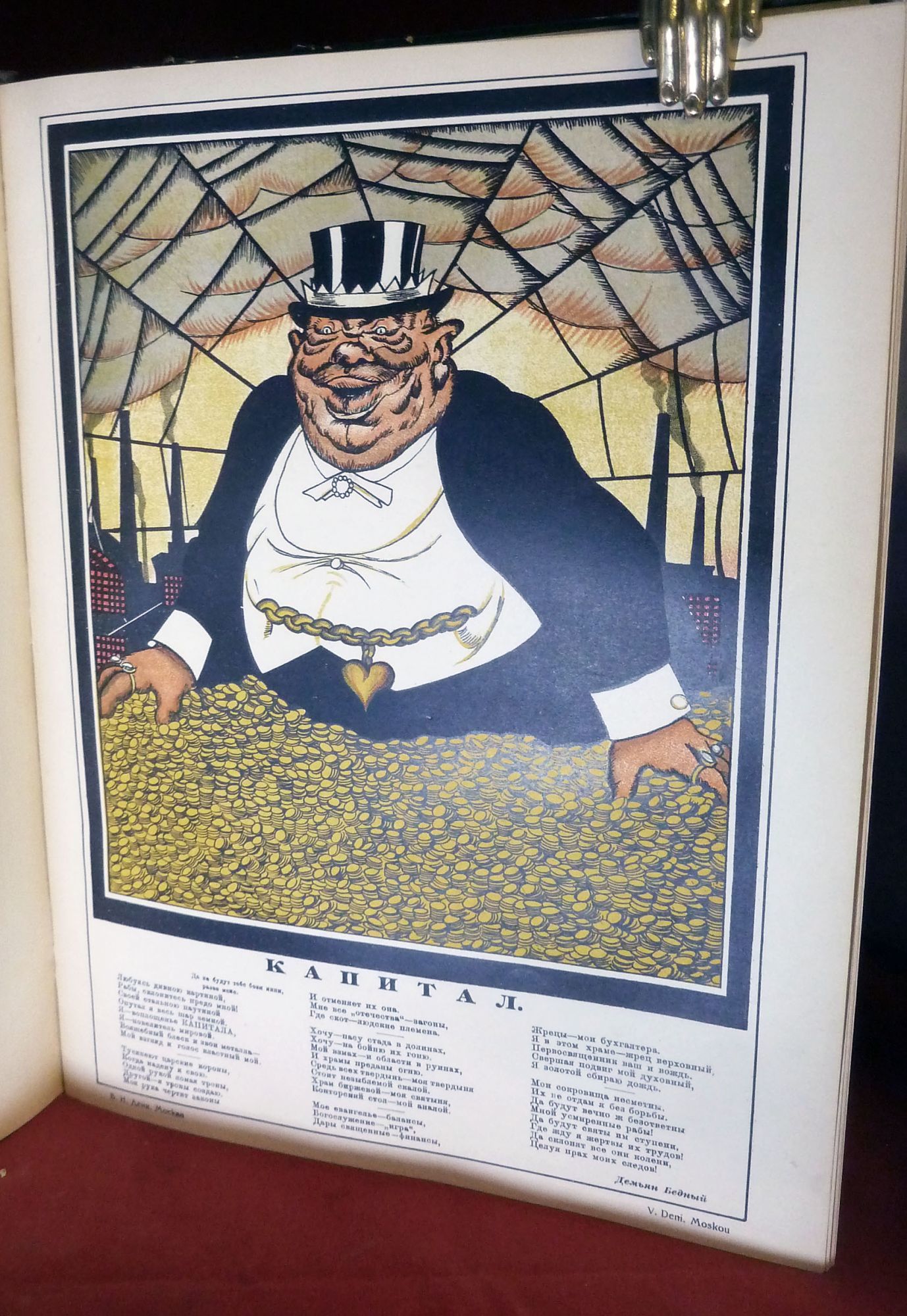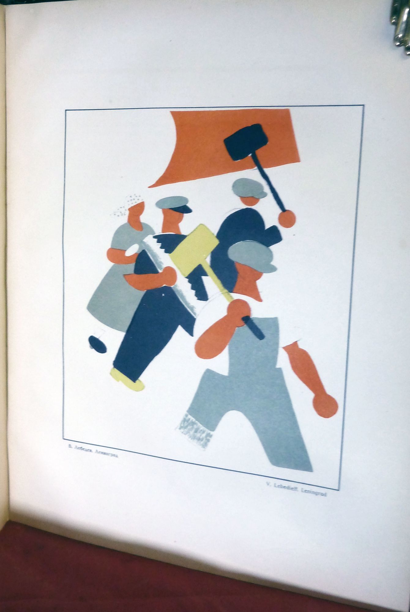 Moscow: Gosudarstvennoye Izdatel'stvo, 1924. First edition. Hardcover. Orig. pictorial boards in red and black, backstrip rebacked in cloth with wear at head. Very good. 192 pages. 35 x 27 cm. Fifty-six color lithographs and 129 black and white text illustrations, depicting more than 850 posters with descriptive text for each. A comprehensive catalogue of revolutionary posters by Demi, Ivanov, Lebedev, Mayakovsky, Melnikov, Moor, Spasky, Tcheremnick, et al., produced between 1917-1925 -- with homage to Marx and Lenin, the first two color plates. Index. Laid-in, practically every page type-written translation in German of poster headline. RUSSIAN AVANT GARDE BOOK 576. Owner inscription dated 1933, interior contents clean and fresh, extremity wear.