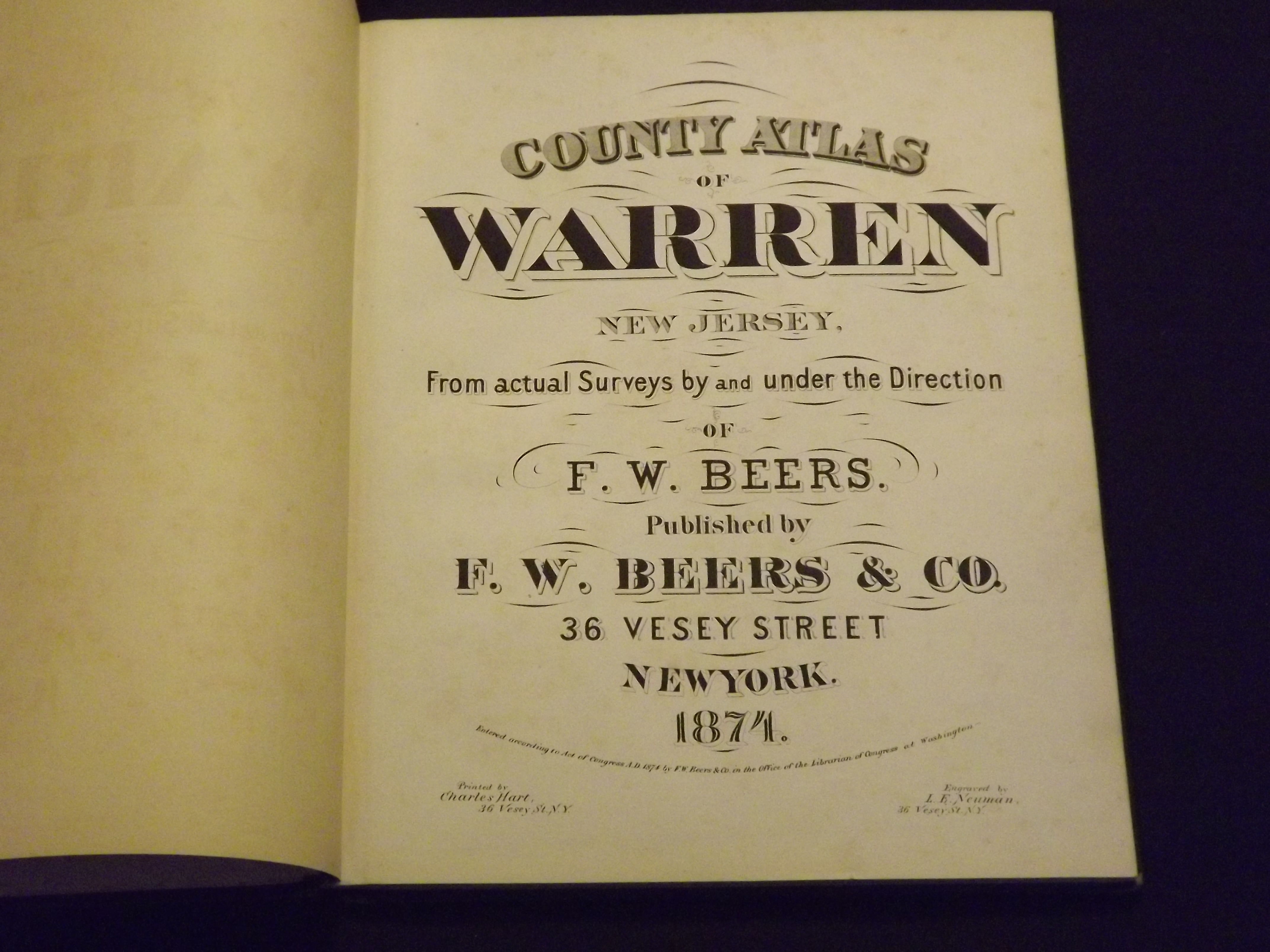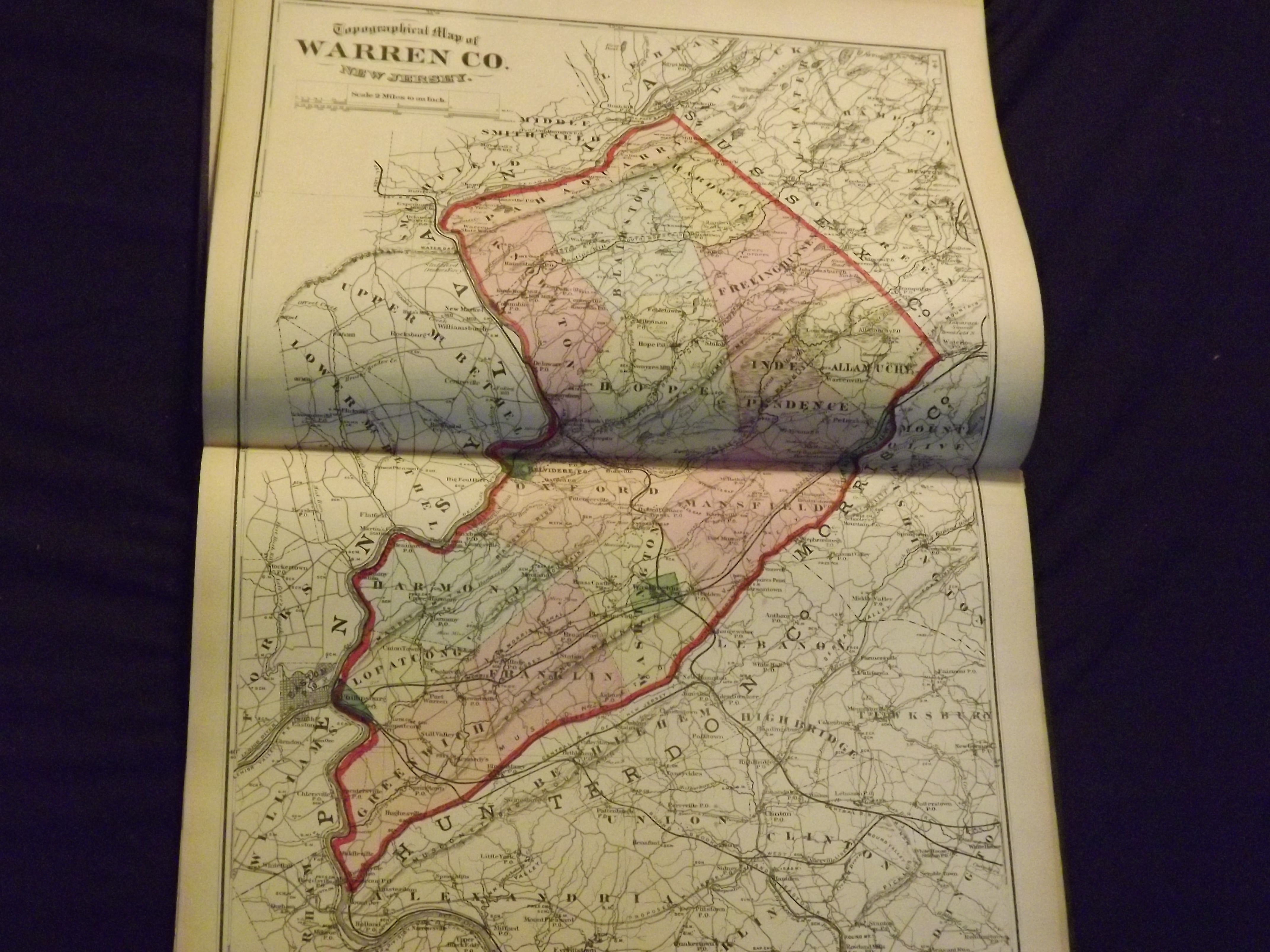 Folio, leather spine & cloth, 33 maps, 92 pp. Joints cracked, but covers still attached, some wear and tears to binding, map of Pahaquarry is loose, with some tears and damage outside margins, some discoloration extends a little into map image, one Washington map has a margin tear, all other maps, including the folding maps are in very good condition; some foxing and aging, but generally bright and clean internally. Rather rare atlas of Warren County New Jersey. Auction records indicate this atlas has come up for sale only four times in the last 25 years, and fetched over $1,000 the last time out. Includes maps of the United States, New Jersey, Warren County, along with those of Hope, Knowlton, Independence, and Hackettstown. Extra postage required.Phillips 2171