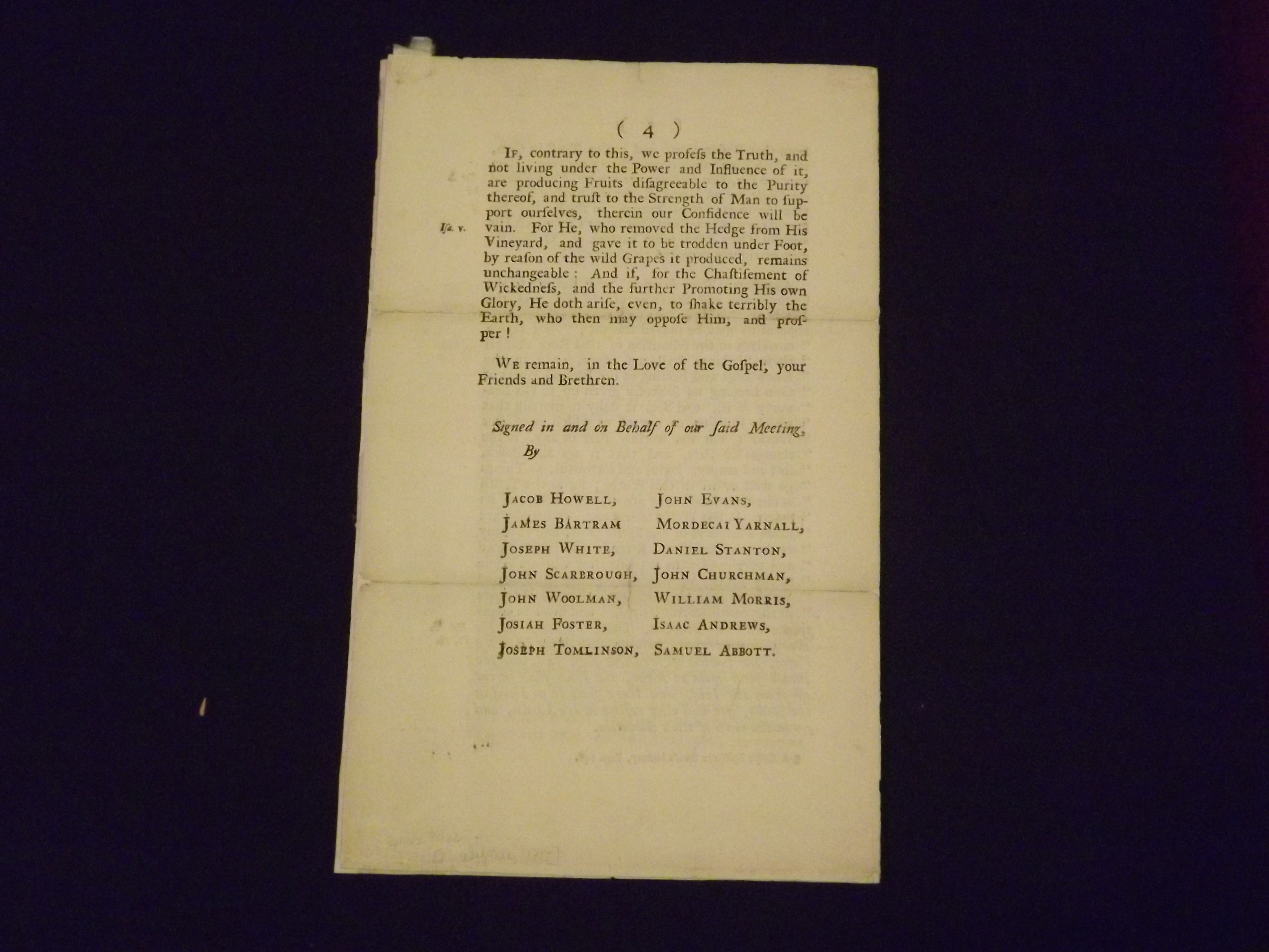 Folio, unbound, 4 pp. Nicely restored repairing separations at folds, and chips and edges. Normal aging, and generally very clean. Summary religious tract that talks about the kingdom of heaven and earth. The pamphlet suggests we shouldn’t be distracted by worldly possessions and enjoyments, but that we should focus on what God wants and expects. Signed in print by 14 ministers and elders. Evans 7422