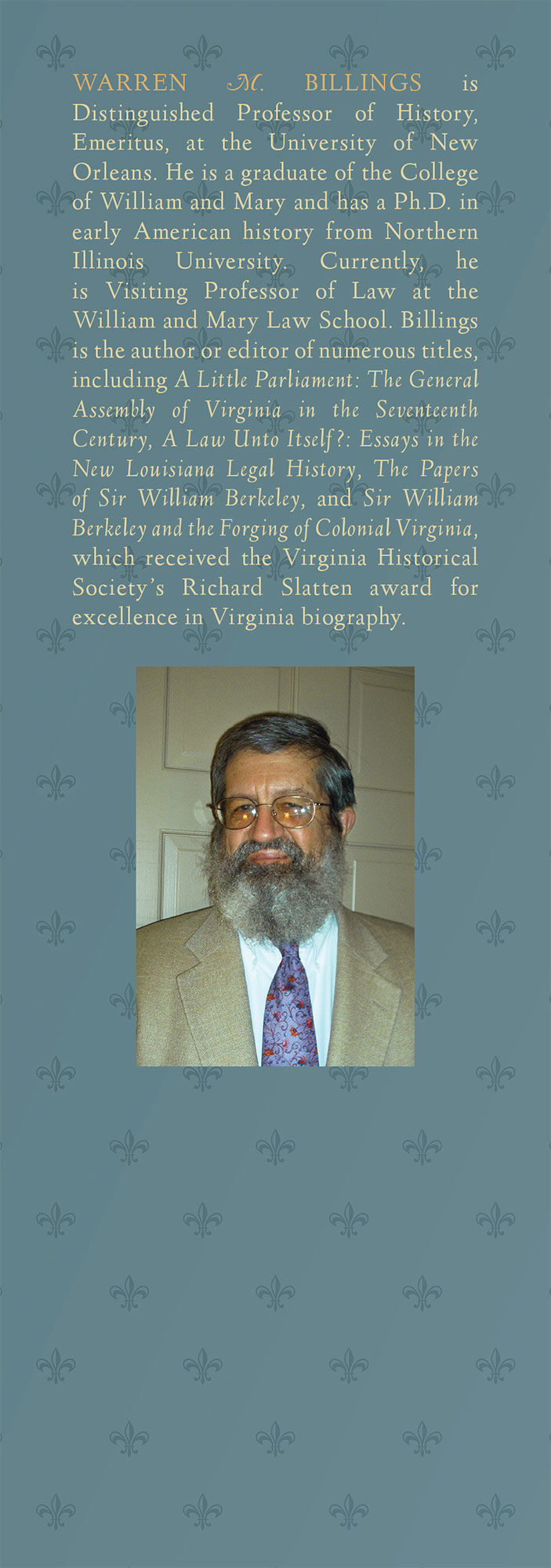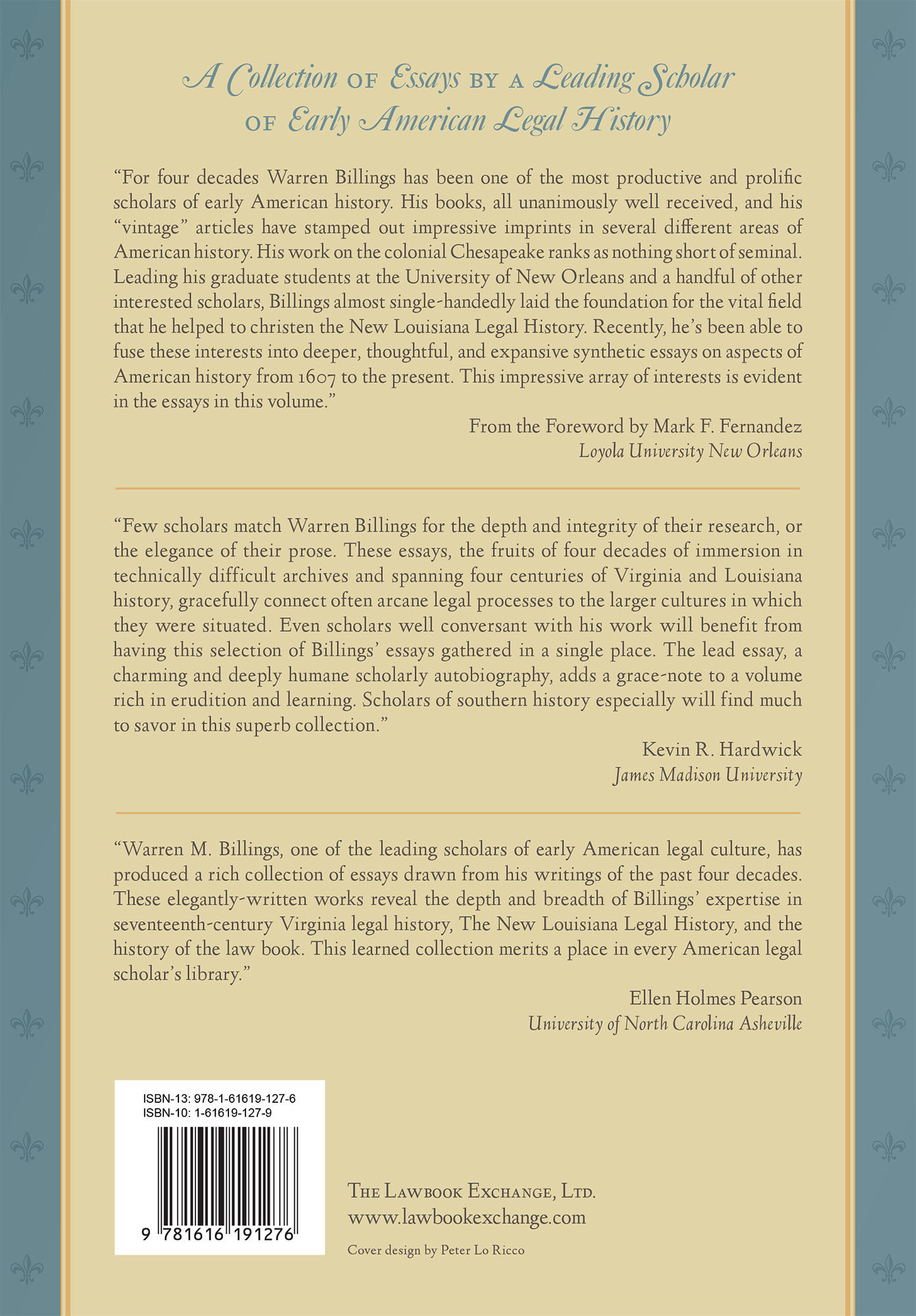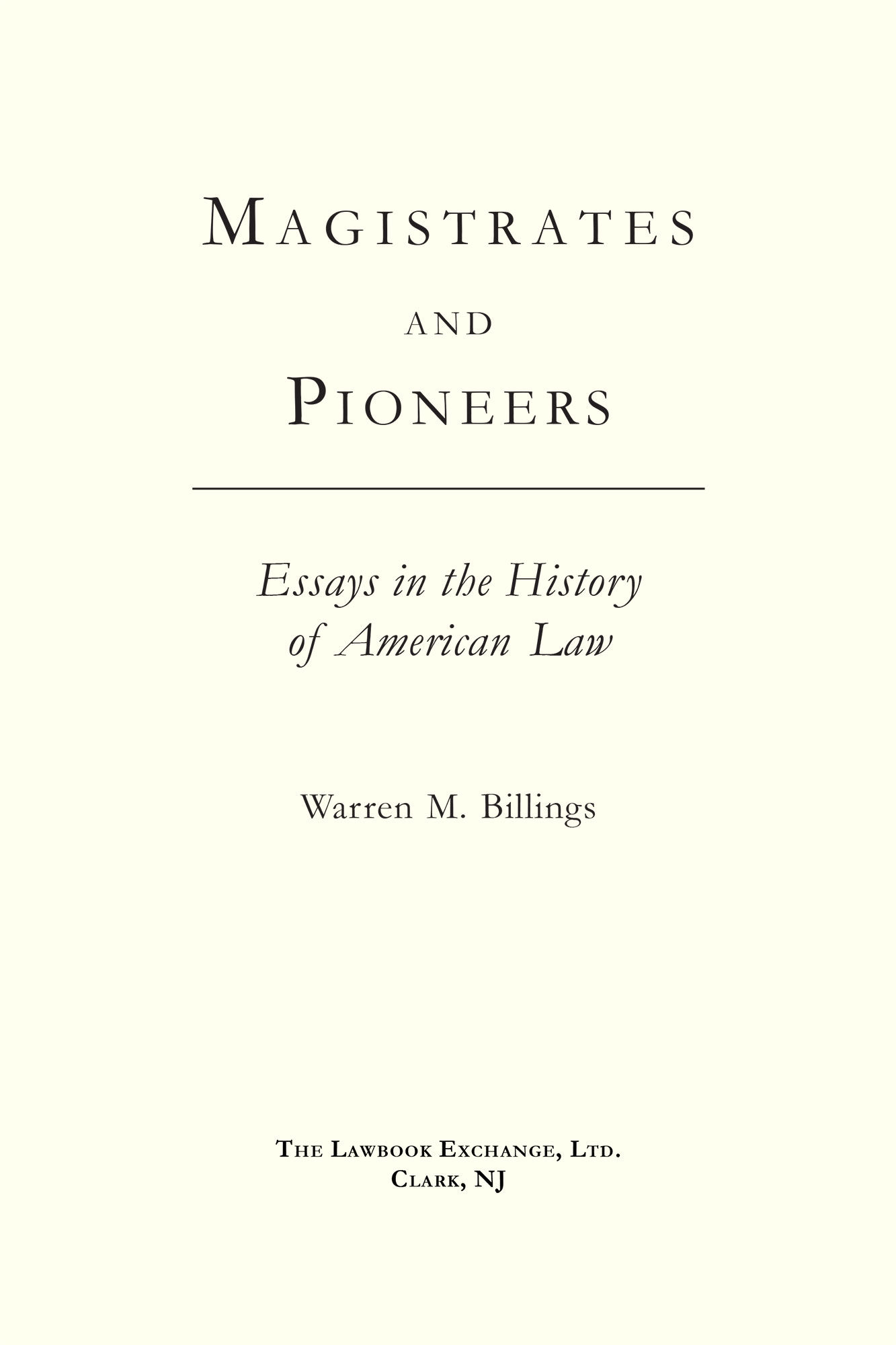 2011. ISBN-13: 9781616191276; ISBN-10: 1616191279. A Collection of Essays by a Leading Scholar of Early American Legal History Billings, Warren M. Magistrates and Pioneers: Essays in the History of American Law. Foreword by Mark F. Fernandez. Clark, New Jersey: The Lawbook Exchange, Ltd., 2011. xix, 460 pp. ISBN-13: 9781616191276; ISBN-10: 1616191279. Hardcover. New. $59.95 * Magistrates and Pioneers collects eighteen essays (five of which are new) by the historian Warren M. Billings. They address the main areas of his research, nineteenth century Louisiana and seventeenth century Virginia. From Opechancanough, a seventeenth-century Indian chief to Sir William Berkeley, colonial governor of Virginia, to Edward Livingston, coauthor of Louisiana's first civil code, to the legendary Louisiana Governor and U.S. Senator Huey Long, Billings brings to life the forces behind the legal development of these two historically distinctive states. Many of these are classic essays, all are essential to students of American legal history. Warren M. Billings is Distinguished Professor of History, Emeritus, at the University of New Orleans. He is a graduate of the College of William and Mary and has a Ph.D. in early American history from Northern Illinois University. Currently, he is Visiting Professor of Law at the William and Mary Law School. Billings is the author or editor of numerous titles, including A Little Parliament: The General Assembly of Virginia in the Seventeenth Century, A Law Unto Itself?: Essays in the New Louisiana Legal History, The Papers of Sir William Berkeley, and Sir William Berkeley and the Forging of Colonial Virginia, which received the Virginia Historical Society's Richard Slatten award for excellence in Virginia biography. "Few scholars match Warren Billings for the depth and integrity of their research, or the elegance of their prose. These essays, the fruits of four decades of immersion in technically difficult archives and spanning four centuries of Virginia and Louisiana history, gracefully connect often arcane legal processes to the larger cultures in which they were situated. Even scholars well conversant with his work will benefit from having this selection of Billings' essays gathered in a single place. The lead essay, a charming and deeply humane scholarly autobiography, adds a grace-note to a volume rich in erudit.