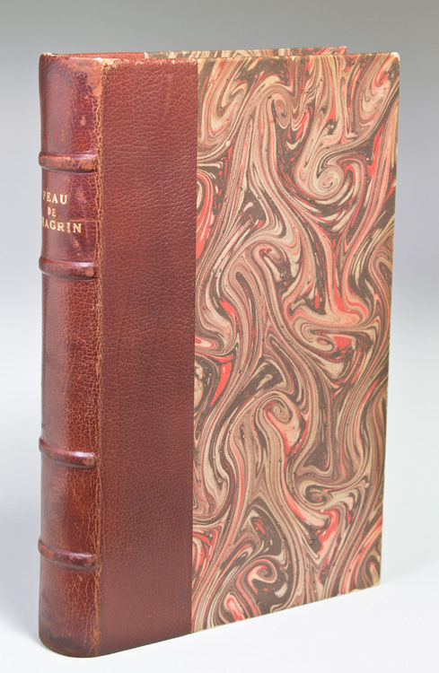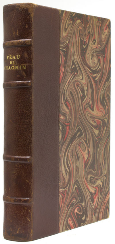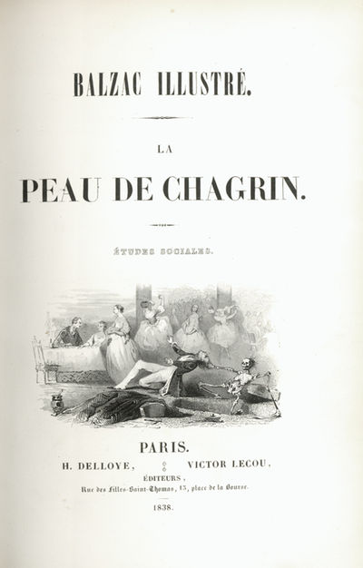 Paris: H. Delloye et Victor Lecou, Éditeurs, Rue des Filles-Saint-Thomas, 13, place de la Course, 1838. First Illustrated edition, first printing, with all first printing points as enumerated by Carteret. [iv], 402, [2] pp. Title with vignette showing a man being pulled backward by skeleton, armed with a scythe, and 100 steel engraved vignettes in the text after drawings by Adam, Baron, Boulanger, Charlet, Daviid, Devéria, Fragonard, Gavarni, Grandville, Grent, Janet-Lange, Johannot, Raffet, Vernet, et. al. 1 vols. Royal 8vo (25.4 cm). Nineteenth-century quarter calf and marbled paper boards. Bookplate of Louis Auchincloss. Minor rubbing to spine and bands, but near fine otherwie, clean and crisp. Lovely copy, with half title. Bookplate of Louis Auchincloss. First Illustrated edition, first printing, with all first printing points as enumerated by Carteret. [iv], 402, [2] pp. Title with vignette showing a man being pulled backward by skeleton, armed with a scythe, and 100 steel engraved vignettes in the text after drawings by Adam, Baron, Boulanger, Charlet, Daviid, Devéria, Fragonard, Gavarni, Grandville, Grent, Janet-Lange, Johannot, Raffet, Vernet, et. al. 1 vols. Royal 8vo (25.4 cm). First illustrated edition of Balzac’s renowned 1831 novel, his first major commercial success, lavishly produced in a generous format, with superb illustrations by many of France’s finest illustrators of the period. From the library of American novelist, LOUIS AUCHINCLOSS. Carteret, III, pp. 41-42; Sander 43; Brivois 15-17; Vicaire I, 45