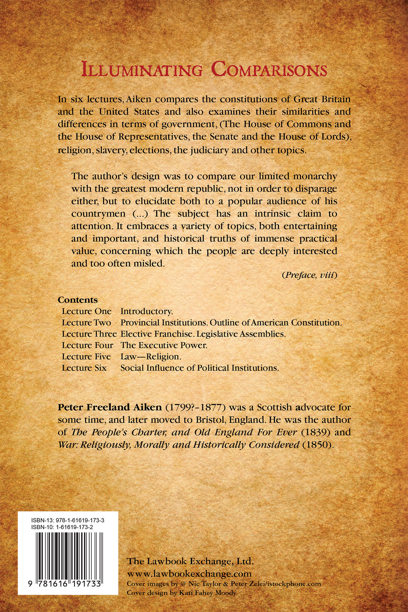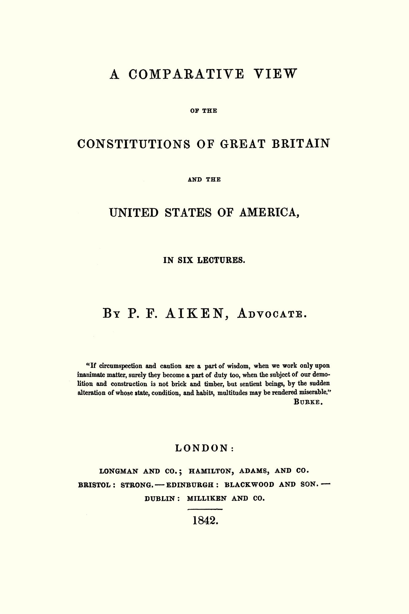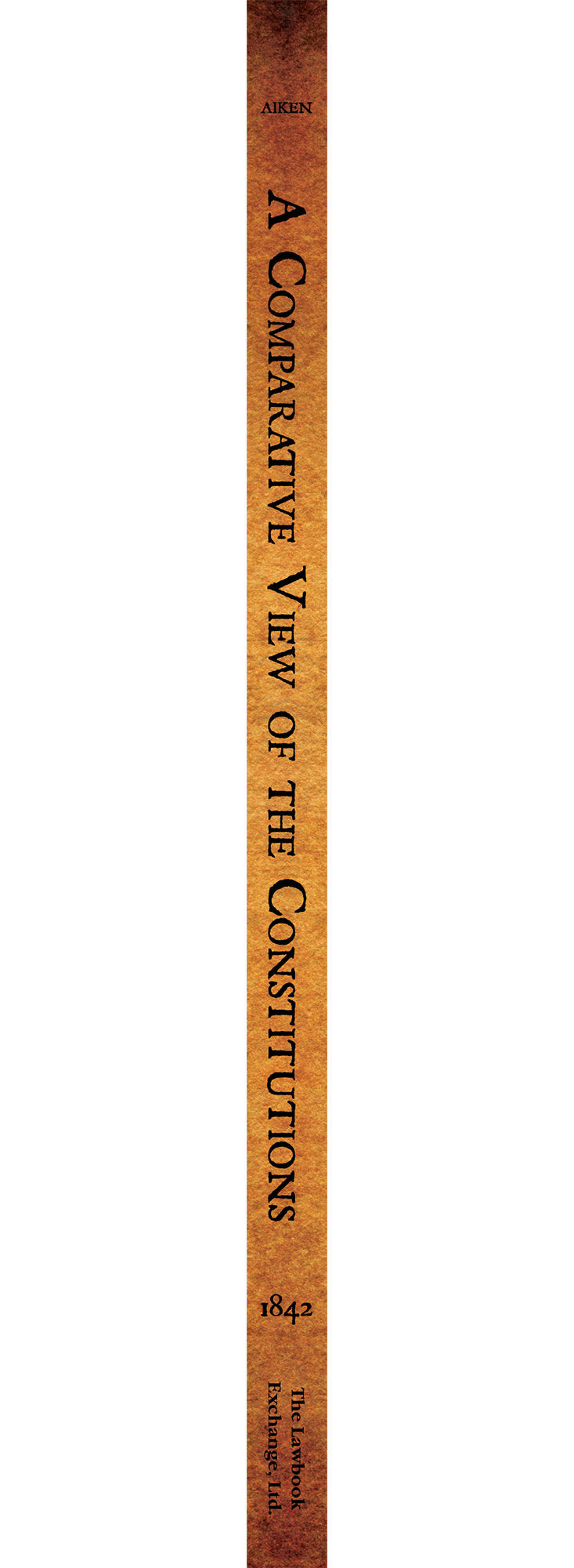 2011. ISBN-13: 9781616191733; ISBN-10: 1616191732. Aiken, P[eter] F[reeland]. A Comparative View of the Constitutions of Great Britain and the United States of America. In Six Lectures. Originally published: London: Longman and Co., 1842. viii, 192 pp. Reprinted 2011 by The Lawbook Exchange, Ltd. ISBN-13: 9781616191733; ISBN-10: 1616191732. Paperback. New. $17.50 * In six lectures, Aiken compares the constitutions of Great Britain and the United States and also examines their similarities and differences in terms of government, (The House of Commons and the House of Representatives, the Senate and the House of Lords), religion, slavery, elections, the judiciary and other topics. "The author's design was to compare our limited monarchy with the greatest modern republic, not in order to disparage either, but to elucidate both to a popular audience of his countrymen (...) The subject has an intrinsic claim to attention. It embraces a variety of topics, both entertaining and important, and historical truths of immense practical value, concerning which the people are deeply interested and too often misled." --Preface, viii CONTENTS: Lecture One: Introductory Lecture Two: Provincial Institutions. Outline of American Constitution. Lecture Three: Elective Franchise. Legislative Assemblies. Lecture Four: The Executive Power. Lecture Five: Law-Religion. Lecture Six: Social Influence of Political Institutions. Peter Freeland Aiken [1799?-1877] was a Scottish advocate for some time, and later moved to Bristol, England. He was the author of The People's Charter, and Old England For Ever (1839) and War: Religiously, Morally and Historically Considered (1850).