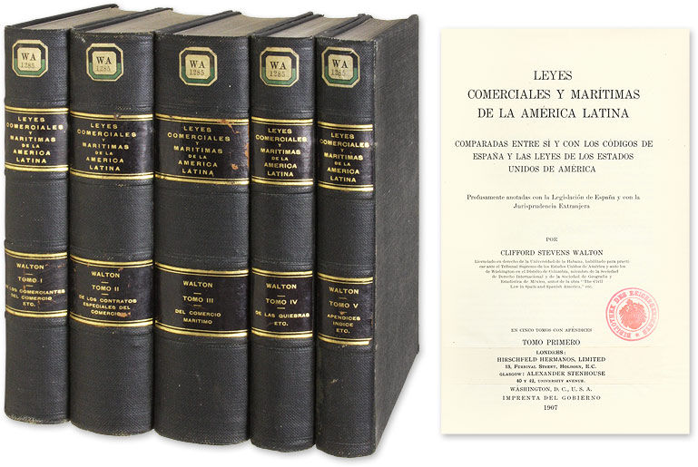 1907. Walton, Clifford Stevens. Leyes Comerciales Y Maritimas de la America Latina: Comparadas Entre si y Con Los Codigos de Espana y Las Leyes de Los Estados Unidos de America. Profusamente Anotadas con la Legislacion de Espana y Con la Jurisprudencia Extranjera. Washington: Imprenta del Gobierno, 1907. 5 volumes. Original cloth, light rubbing to extremities, internally clean. Ex-library. Location labels to spines, bookplates, brief annotations in pencil to front endleaves, small inkstamps to title pages. A very good set. $250. * Walton, an American jurist and legal historian, was an expert on the legal systems of Spain and Latin America.