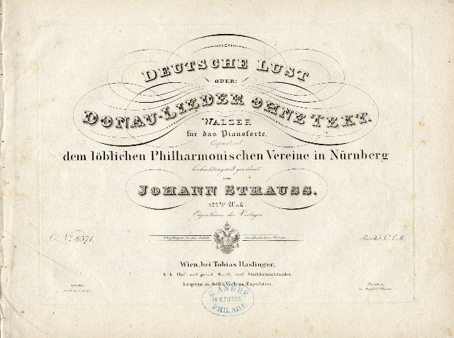 Wien: Tobias Haslinger [PN] T.H. 8371, 1849. Oblong folio. Disbound. [1] (title), [2] (blank), 3-11 (music), [i] (publisher's catalogue of Strauss's waltzes up to op. 237), [i] (blank) pp. With 19th century Philadelphia music seller's handstamp to title.