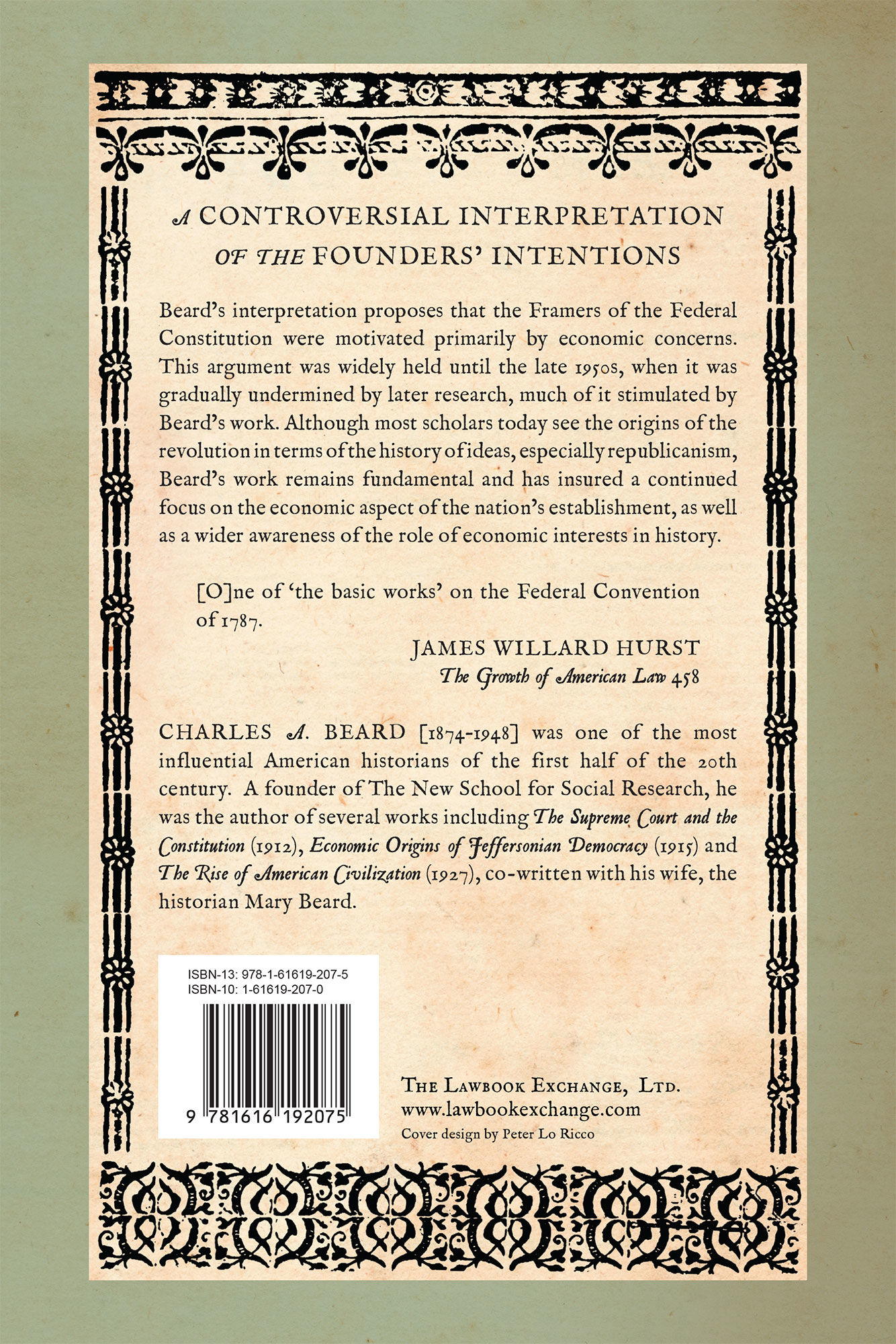 2011. ISBN-13: 9781616192075; ISBN-10: 1616192070. Beard, Charles. An Economic Interpretation of the Constitution of the United States. Originally published: New York: The Macmillan Company, 1925. vii, 330 pp. Reprinted 2011 by The Lawbook Exchange, Ltd. ISBN-13: 9781616192075; ISBN-10: 1616192070. Paperback. New. $26.95 * Beard's interpretation proposes that the Framers of the Federal Constitution were motivated primarily by economic concerns. This argument was widely held until the late 1950s, when it was gradually undermined by later research, much of it stimulated by Beard's work. Although most scholars today see the origins of the revolution in terms of the history of ideas, especially republicanism, Beard's work remains fundamental and has insured a continued focus on the economic aspect of the nation's establishment, as well as a wider awareness of the role of economic interests in history. "...one of 'the basic works' on the Federal Convention of 1787." --James Willard Hurst, The Growth of American Law 458. Charles A. Beard [1874-1948] was one of the most influential American historians of the first half of the 20th century. A founder of The New School for Social Research, he was the author of several works including The Supreme Court and the Constitution (1912), Economic Origins of Jeffersonian Democracy (1915) and The Rise of American Civilization (1927), co-written with his wife, the historian Mary Beard.