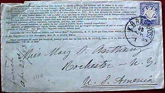 Autograph. Fine. An envelope (6" x 3-1/4") with a lengthy printed statement by The Citizens' Suffrage Association. Although not signed by her, it is addressed in the hand of Susan B. Anthony to her younger sister: "Miss Mary S. Anthony/Rochester -- N. Y./U. S. America." On the side of the envelope is written "Zurich/Apr 23rd 83," likely in one of the sisters' hands.
