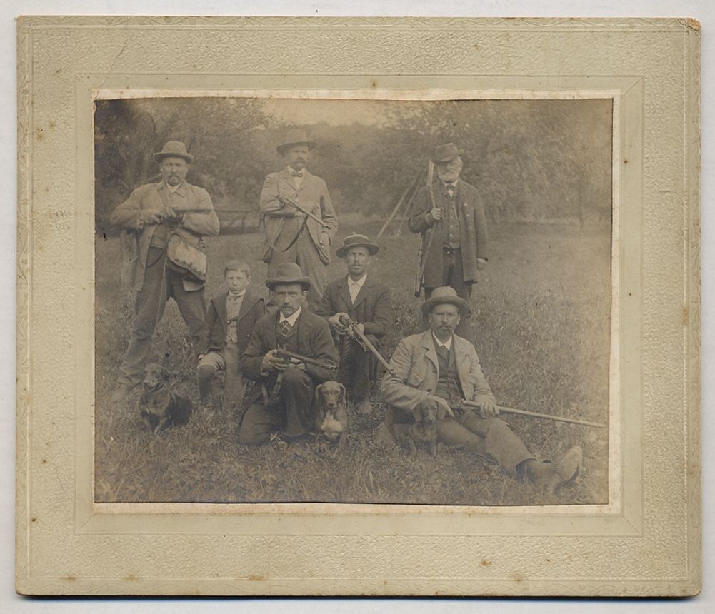 Unbound. Very Good. Image size approximately 5" x 4" on approximately 6.5" x 5.5" mount. Light general wear on the mount, image is about fine. Unsigned or dated, but from a group of North Dakota material circa 1910. Six grim looking sportsmen pose with shotguns, with a young boy among them.
