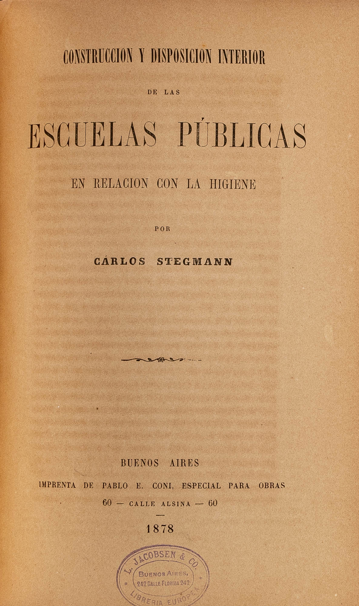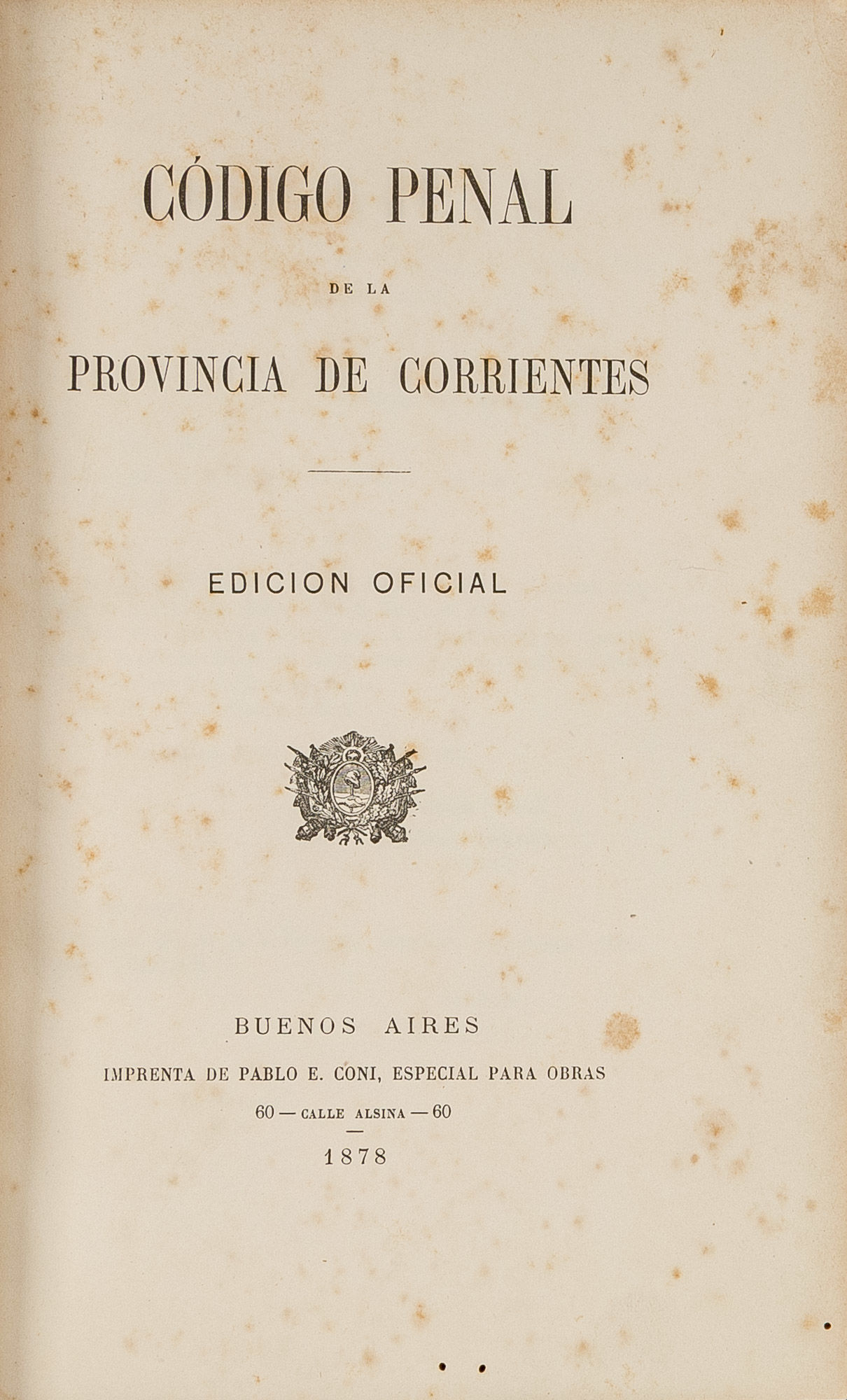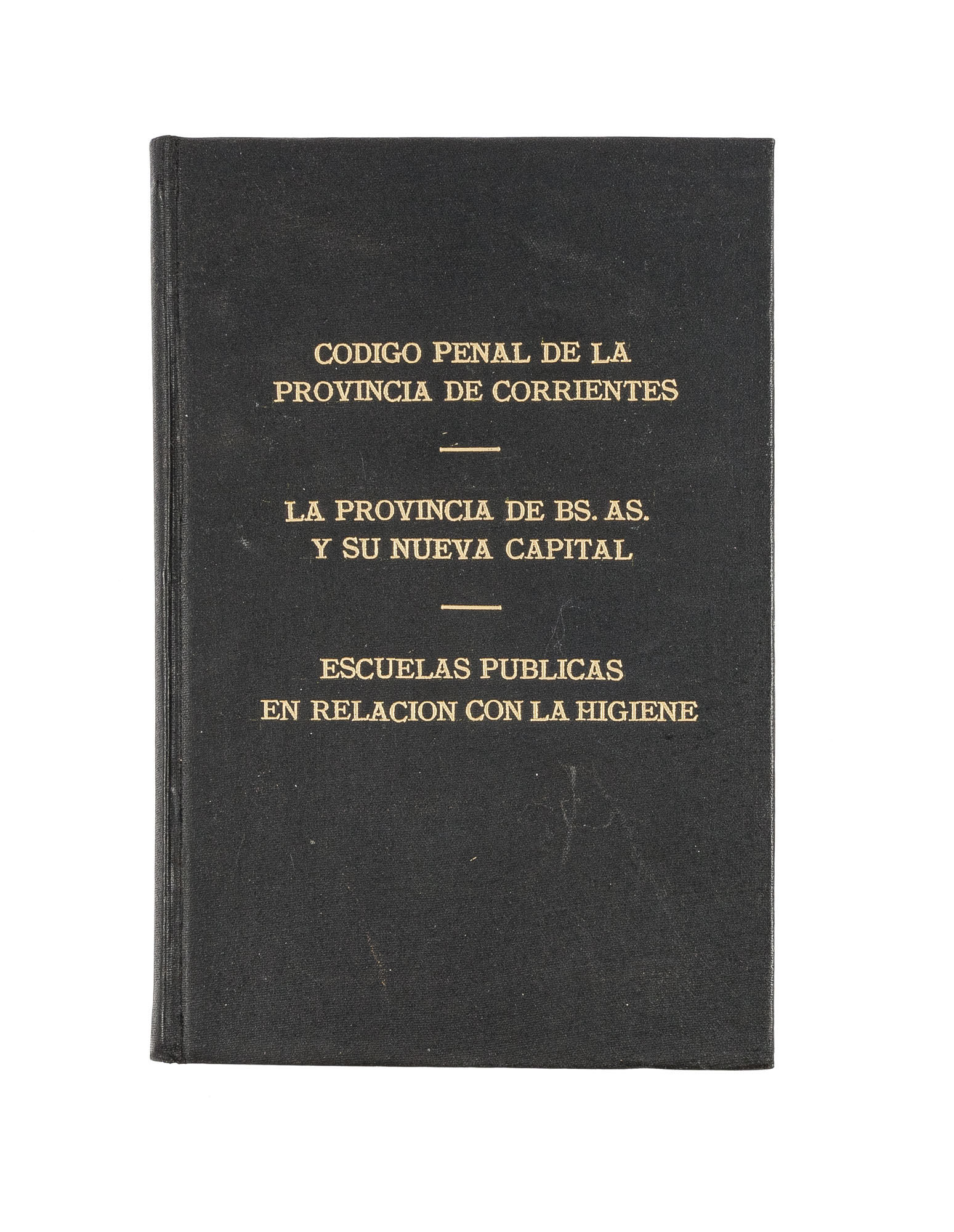 1873. 3 titles, all rare; the last with 5 plates. 3 titles, all rare; the last with 5 plates. Three Rare Argentinean Items [Argentina]. Codigo Penal de la Provincia de Corrientes. Buenos Aires: Imprenta de Pablo E. Coni, 1878. 110 pp. [Bound with] Llerena, Juan. La Provincia de Buenos Aires y su Nueva Capital. Buenos Aires: Establecimiento Tipografico, 1881. 54 pp. [And] Stegmann, Carlos. Construccion y Disposicion Interior de las Escuelas Publicas en Relacion con la Higiene. Buenos Aires: Imprenta de Pablo E. Coni, 1878. 24 pp. Five plates, two folding. Octavo (9-1/4" x 6-1/4"). Later cloth, gilt titles to spine. Light shelfwear, some toning to text, final three leaves of Construccion detached, internally clean. $950. * Only editions located. The first item is the penal code for Corrientes, one of the provinces of Argentina. The second title, which is not legal in nature, is an essay defending the establishment of Buenos Aires as the national capital in 1880. Illustrated with plates depicting classrooms and school furniture, the final title is a book of regulations governing the construction of schools and the furnishing of classrooms. All of these titles are rare. OCLC locates 1 copy each of Corrientes and Provincia (both in Germany), no copies of Construccion. See Borchard, Guide to the Law and Legal Literature of Argentina, Brazil and Chile 115-116.